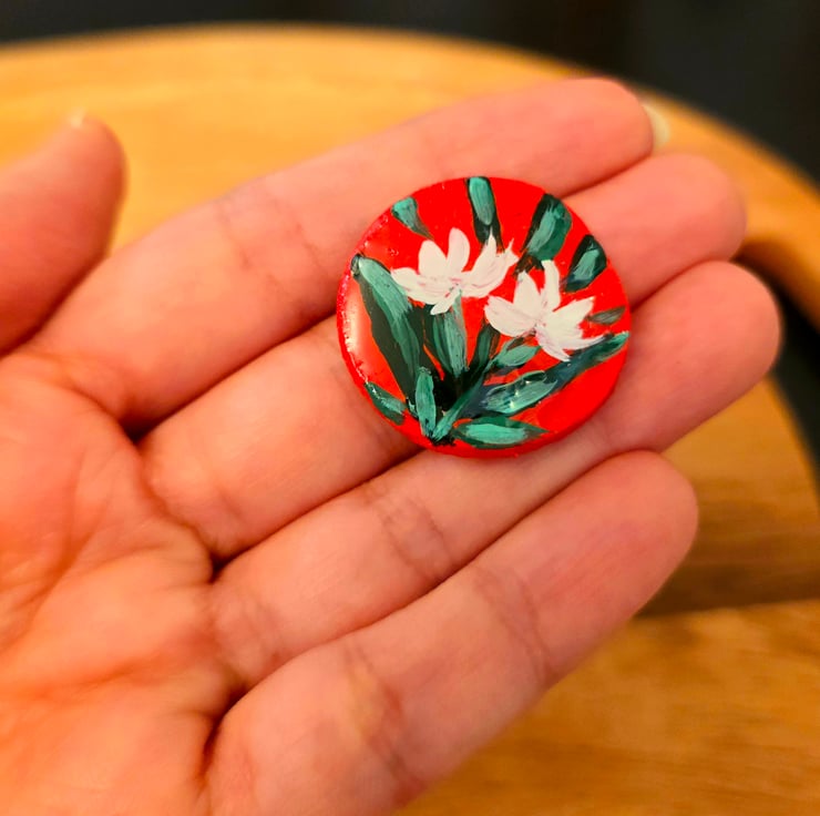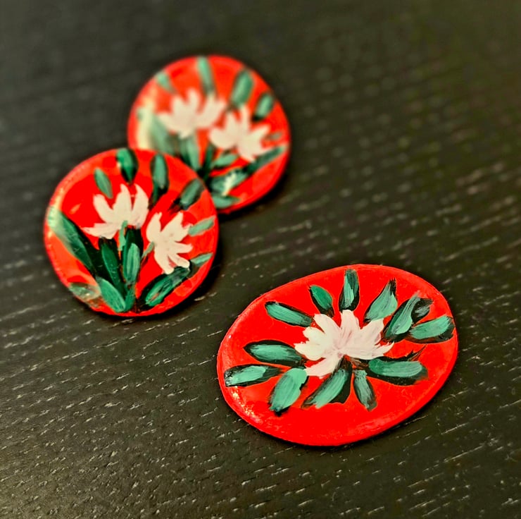 Keep away from water, perfumes, lotions and harsh chemicals to protect the paint and resin finish. Avoid dropping or bending; handmade clay pieces can be delicate. Clean gently with a soft, dry cloth — do not soak or use abrasive cleaners. Store in a cool, dry place, ideally in a jewellery box or pouch to avoid scratches. Slight unevenness or asymmetry is normal due to the handmade nature.