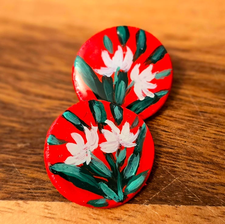 The delicate white flowers stand out beautifully against the vivid red background, giving the earrings an elegant yet playful look.