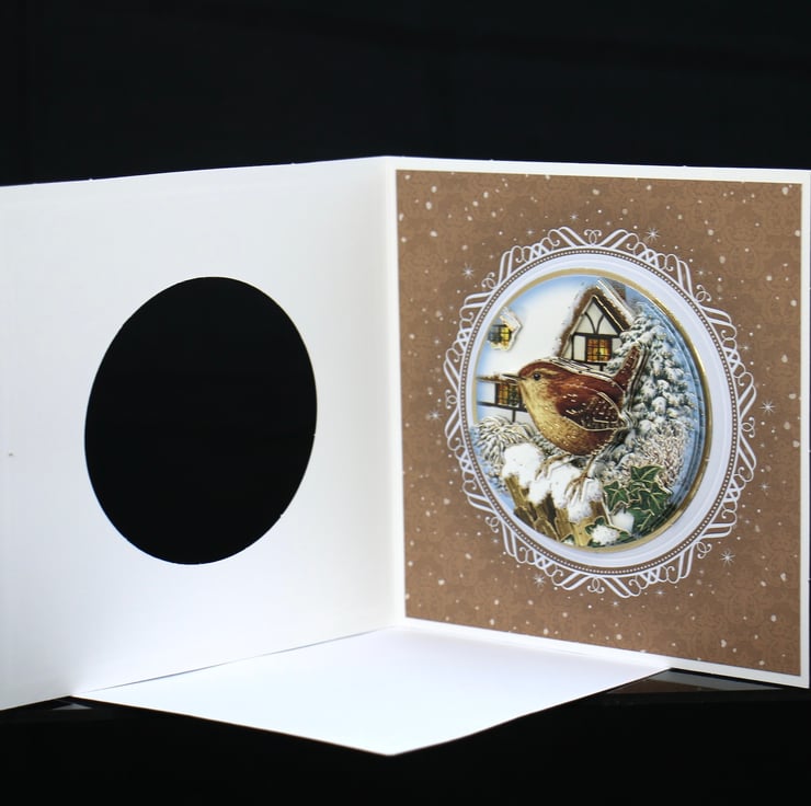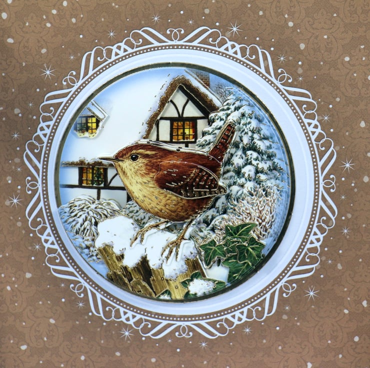I completed the decoupaged, gold foiled 300gsm topper of a wren sitting on fence in a snow-covered garden scene, and layered it onto a 140gsm insert.