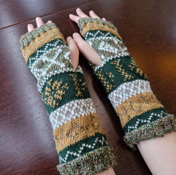These hand crafted wrist warmers or fingerless gloves are my own design. They are homemade using a manual knitting machine using a self-drafted Fairisle pattern. The primary colour used is green, with patterns made using white, gold, and beige.