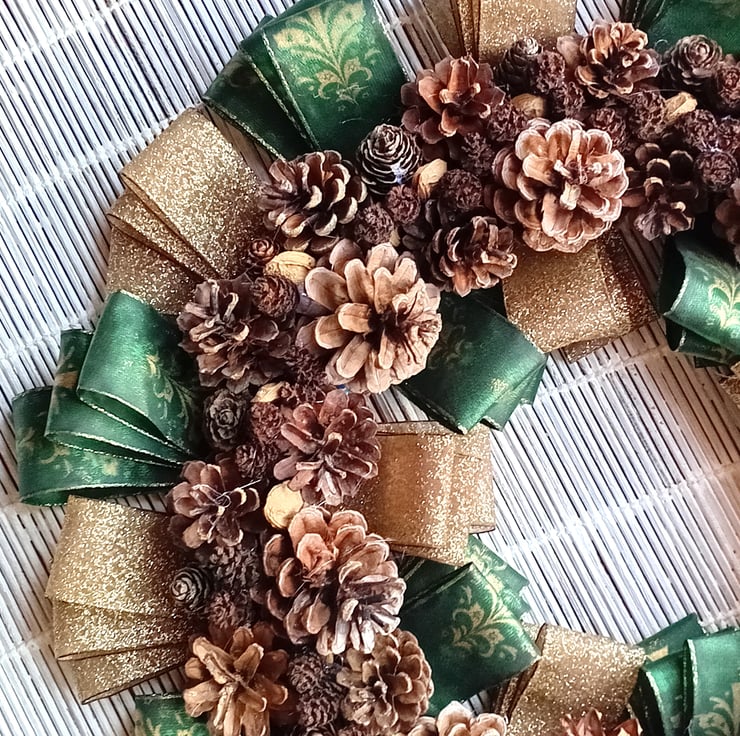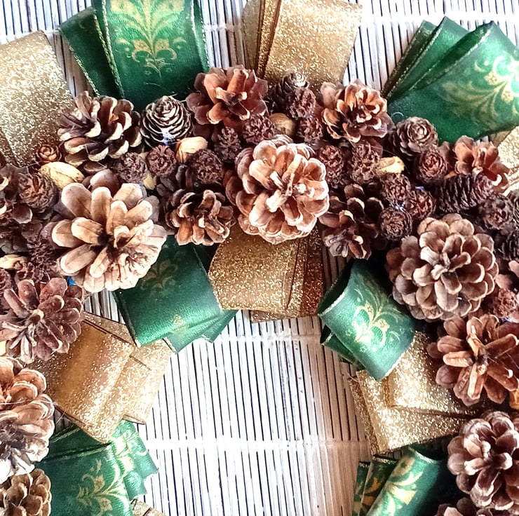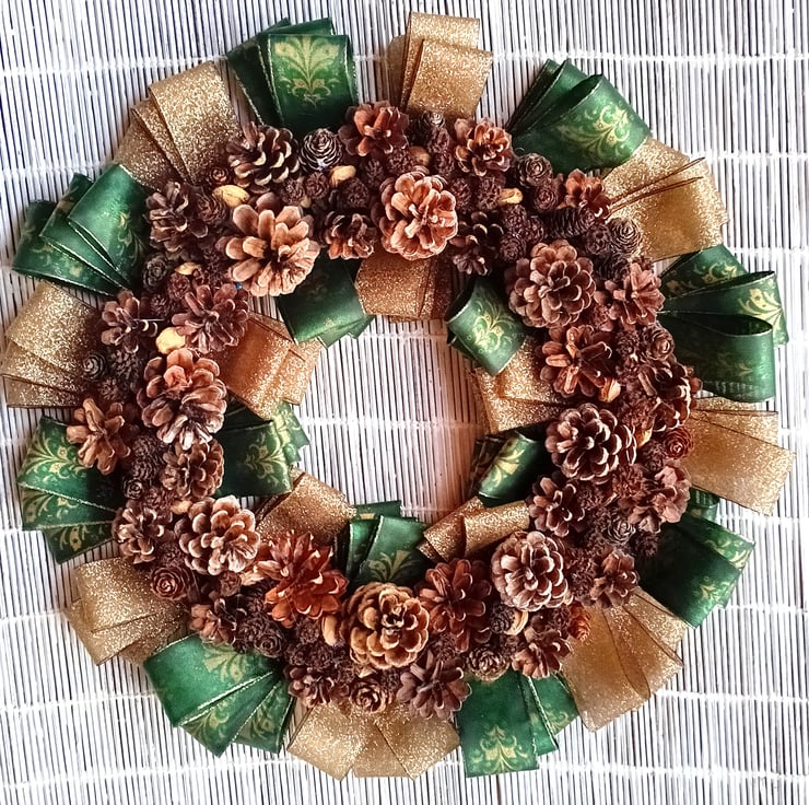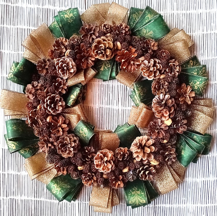 Cone and Ribbon Christmas Wreath in Green and Gold