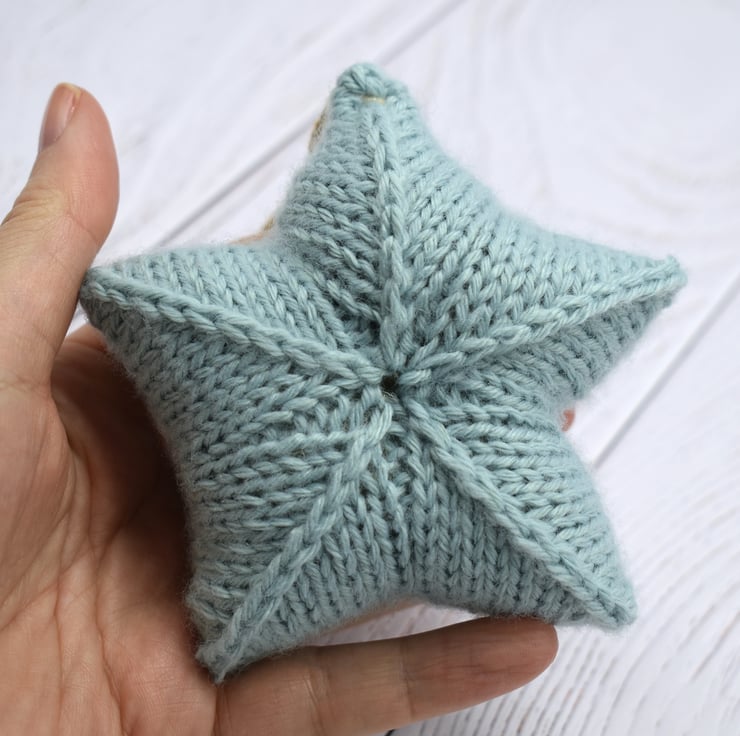 This is a lovely little star, knitted in a soft blue yarn and stuffed with toy grade wool stuffing which conforms to EN71, BS1425, BS5852. The star is finished with brown and silver cotton twine to hang.