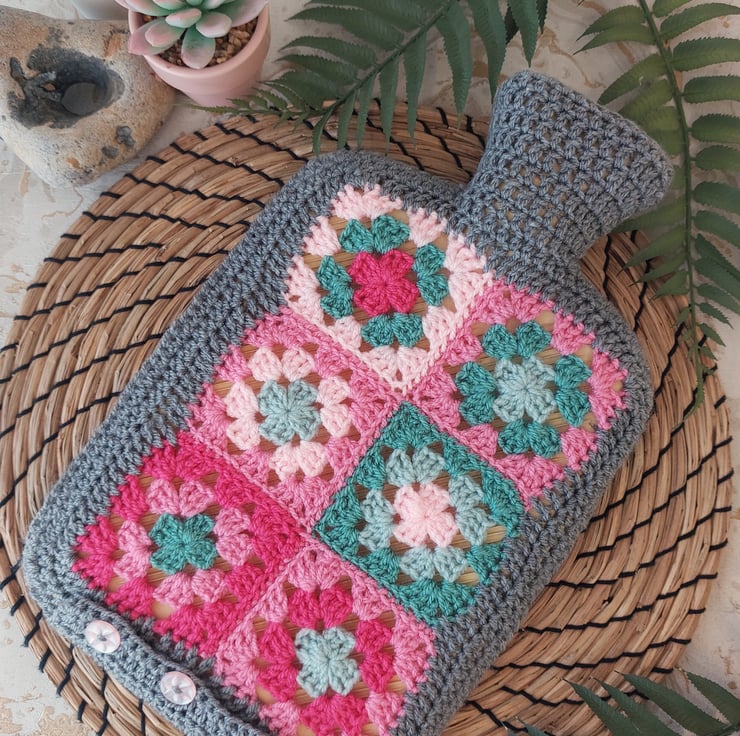 Crochet Hot Water Bottle Cover Patchwork Pink Sage Green & Silver Grey
