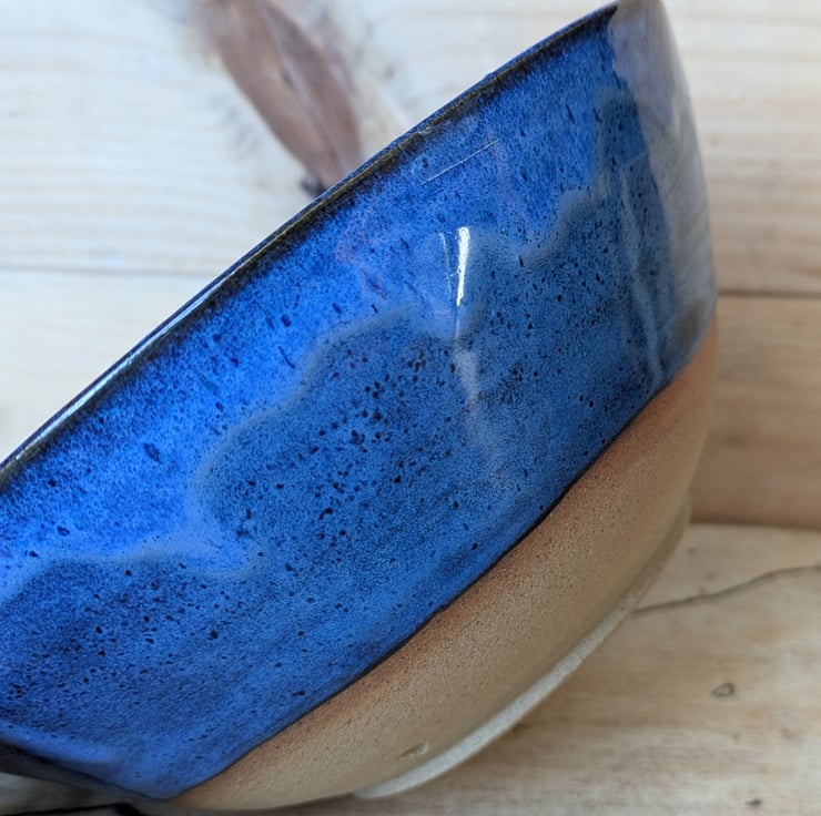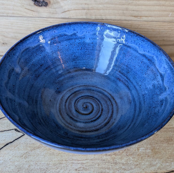 One of my largest bowls to date with a swirl in the base...would make a great serving bowl. Love the way the blue glaze floats so it comes out differently on every piece. I've also used a toasted clay this time and left the bottom section unglazed outside to show off the clay.
