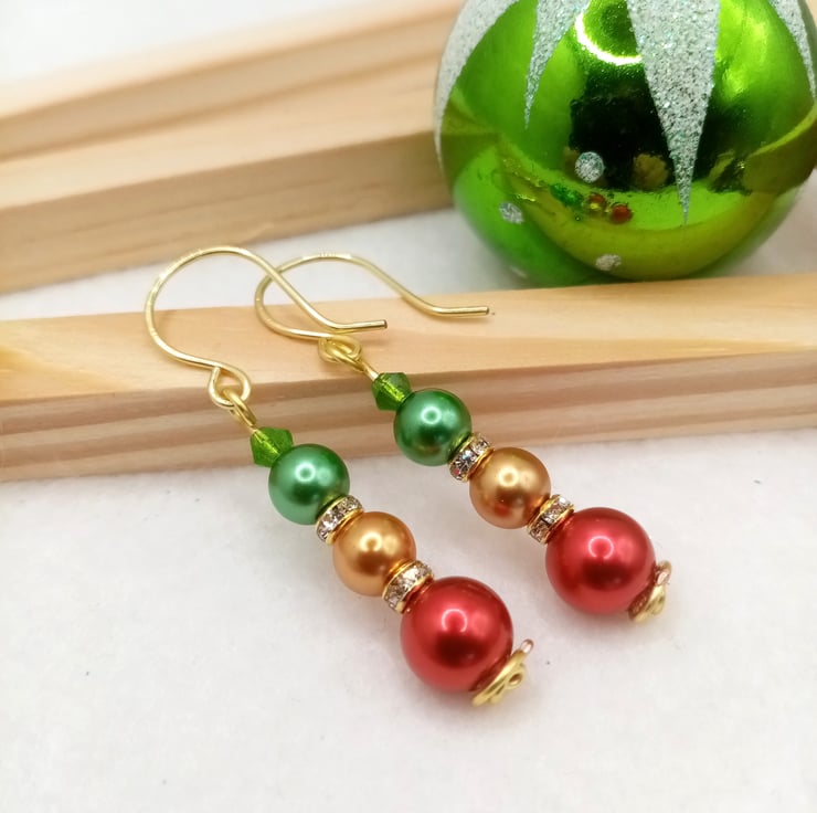 Christmas Bauble Inspired Earrings, Red-Green-Gold Pearl Drop Earrings, Pearls