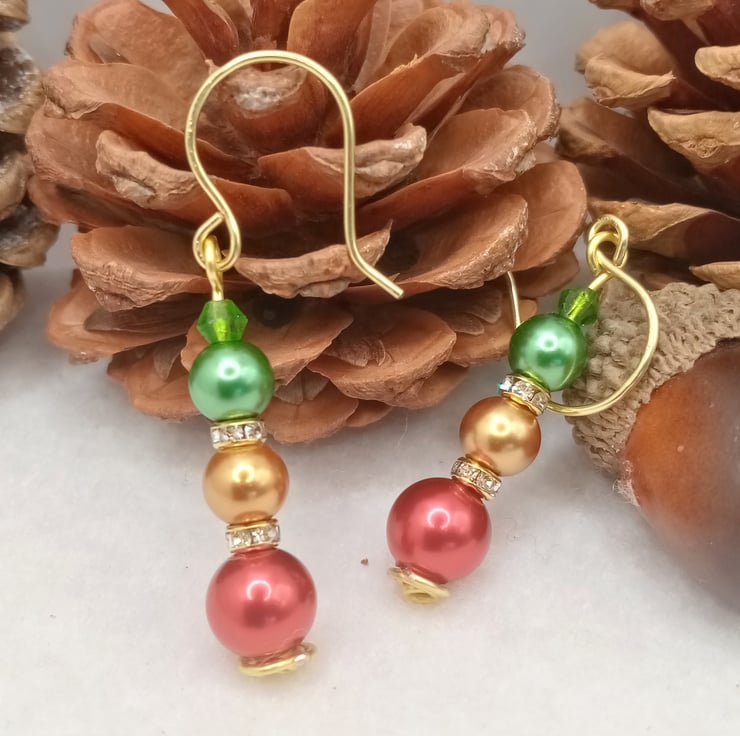 These Christmas bauble party earrings are made using one 8mm glass pearl bead, two 6mm glass pearl beads, two gold coloured diamanté spacer rondelles topped off with a 4mm emerald green crystal glass bicone bead.