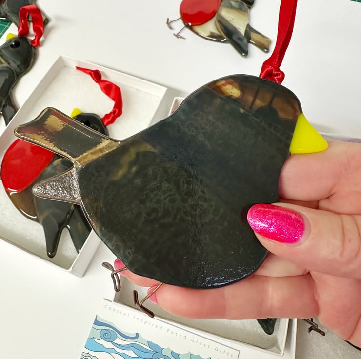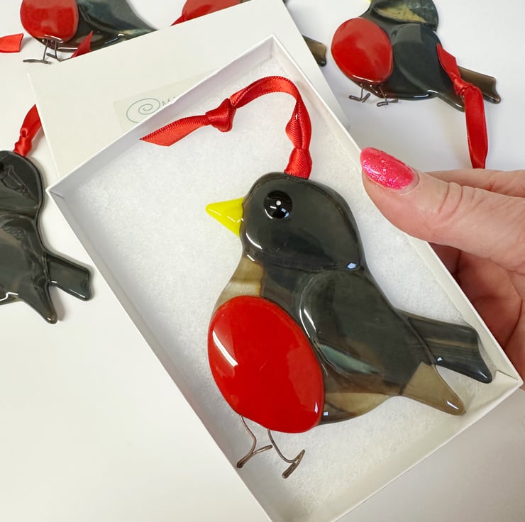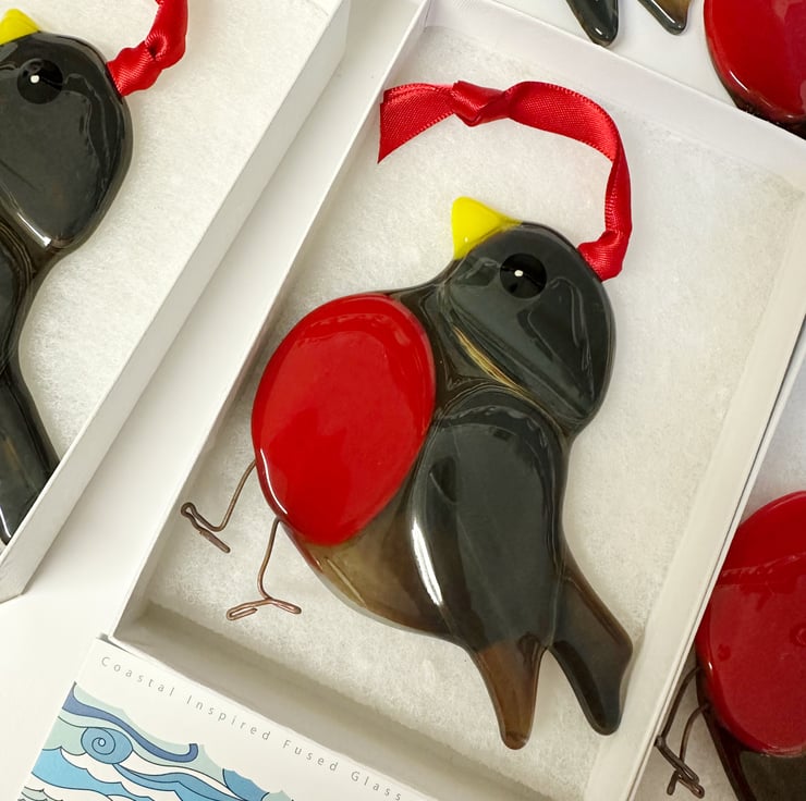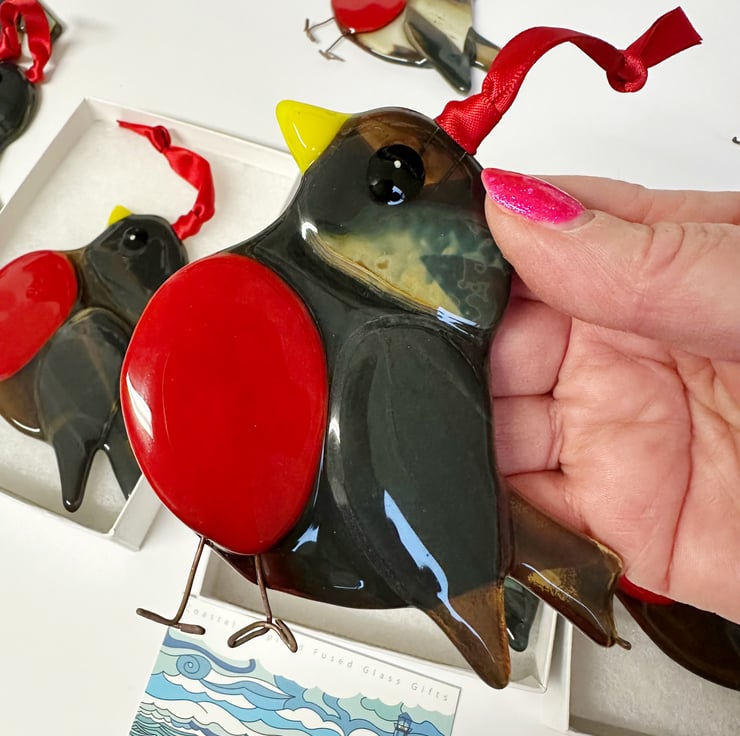 Each part of this adorable Christmas robin has been cut by hand, edges smoothed with a grinder, cleaned and assembled before firing in the kiln.