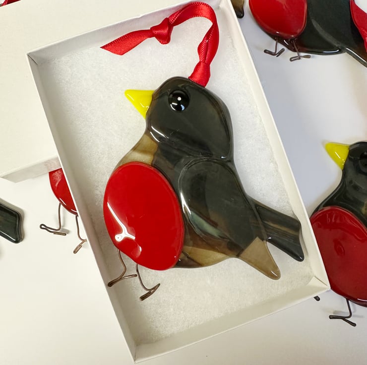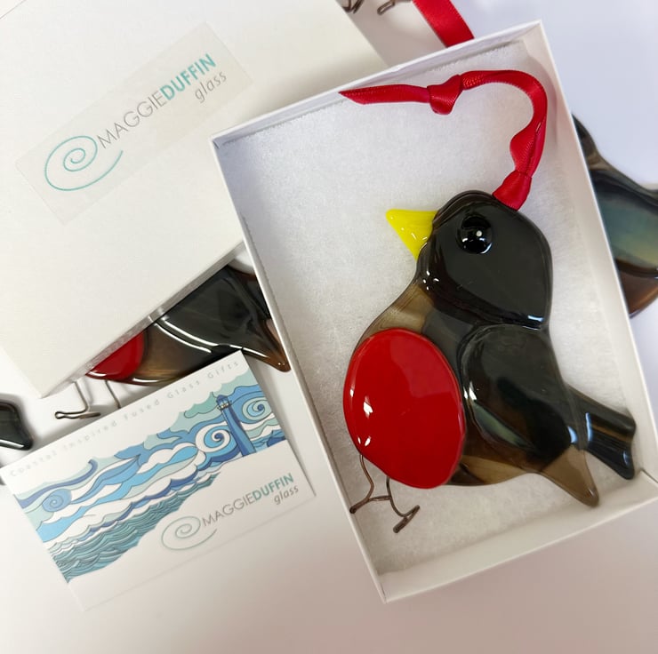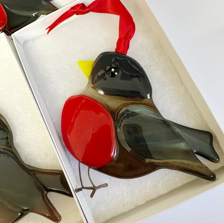 The body, head, wings and tail have been cut from a special glass called 'petrified wood'. This unusual glass is streaky and has multiple colour variations within. Traditional red has been used for the breast of the robin.
