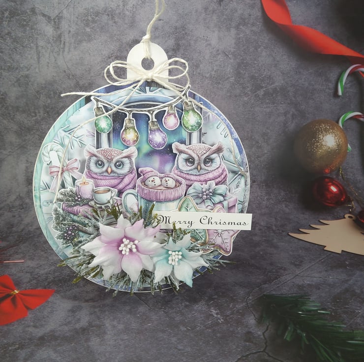 A unique, hand-crafted Christmas decoration measuring 14 cm. Designed as a festive hanging ornament, it features a cosy winter scene with two adorable owls, soft pastel poinsettias and delicate Christmas details.