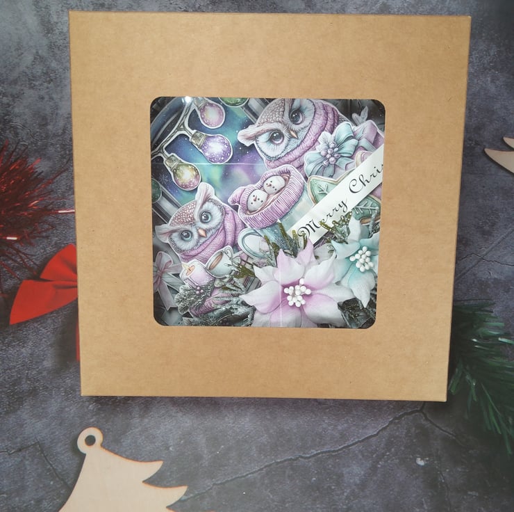 This piece was inspired by magical winter nights, glowing lights and the cosy charm of woodland animals. The pastel colour palette and storybook-style owls create a gentle, enchanting Christmas atmosphere.
