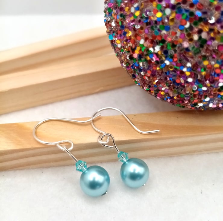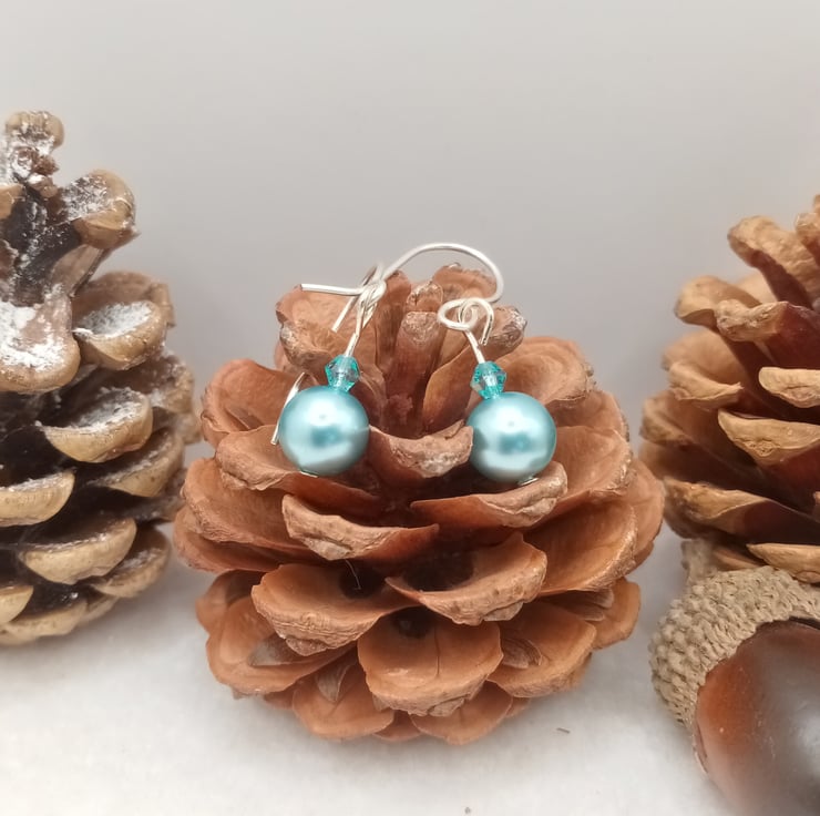 These Christmas bauble-style earrings are made using 8mm glass pearl beads in a soft subtle ice blue colour topped off with a light blue 4mm crystal glass bicone bead.