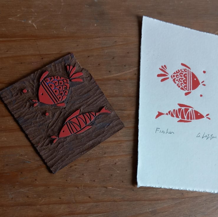 Fishes, Mini Linocut, Original Lino Print by Giuliana Lazzerini
