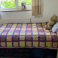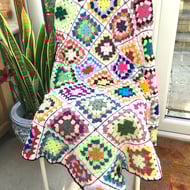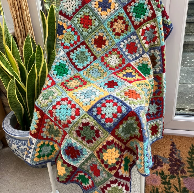This lovely granny square blanket is made from a thick D /K 3/4 acrylic and 1/4 wool. It has a double centre with multi colours, there are 100 squares and it is stitched very carefully together with the denim blue yarn. The edging is double stitched in white then denim blue, it is thick and toasty.