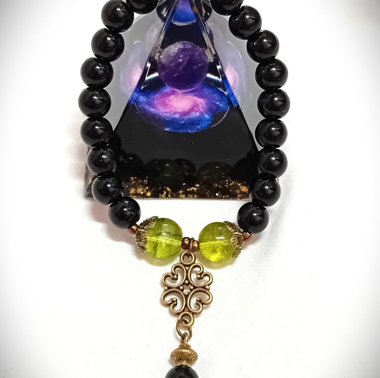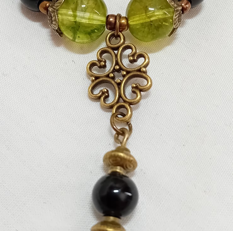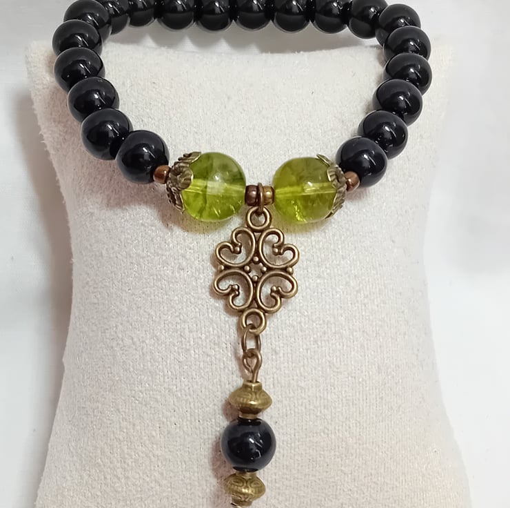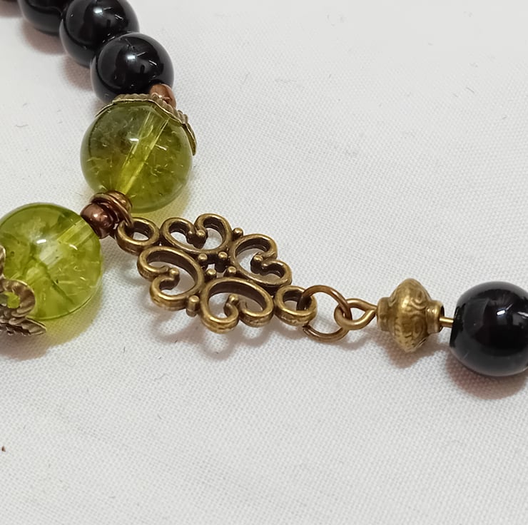 This exquisite bracelet showcases a timeless vintage charm with its elegant bronze accents. Crafted with 8mm Onyx and 10mm Peridot, it exudes a natural and sophisticated appeal. This comes protectively wrapped for shipping and with an Organza gift bag ready for gifting. You may opt for a gift box when choosing your wrist size.