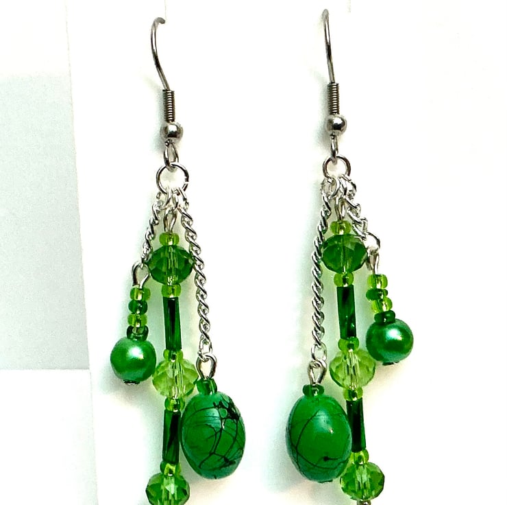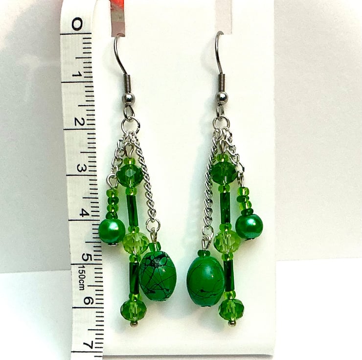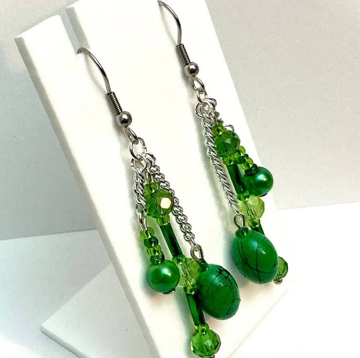 Long, dangly earrings in a beaded cluster style. Lovely shades of Green glass and faux pearl beads with a silver aluminium chain for extra dangle.