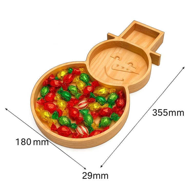 Bring holiday cheer to your home with this beautifully handcrafted wooden snowman serving tray. Designed with three spacious compartments, this festive piece is perfect for filling with wrapped candies, nuts, snacks, or Christmas treats. Its charming carved face and button details make it both a functional serving dish and a delightful decorative centerpiece.