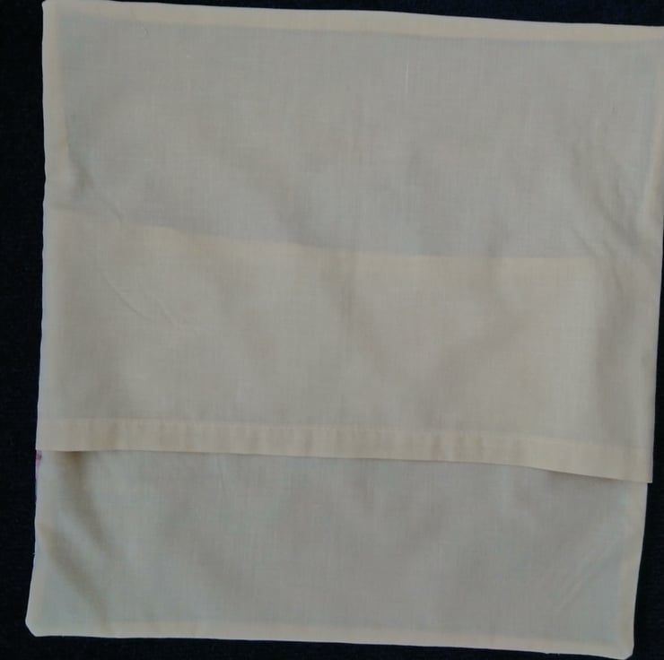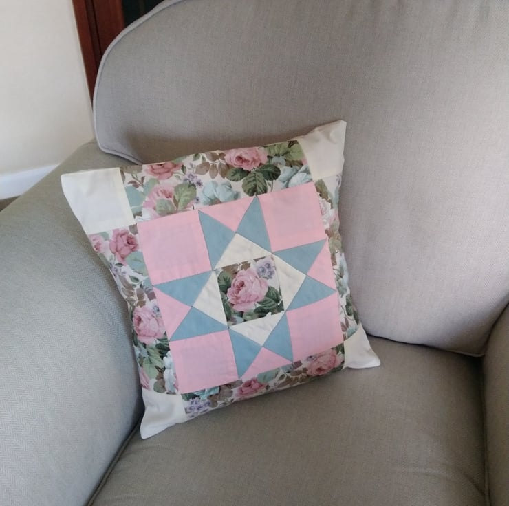 Handsewn cushion cover in pink and green patchwork comprising a floral print (Sanderson), a plain pink, a plain cream, and a slightly textured duck egg green. The reverse is in plain cream cotton, and features a wrap over design for insertion of cushion pad (not included).