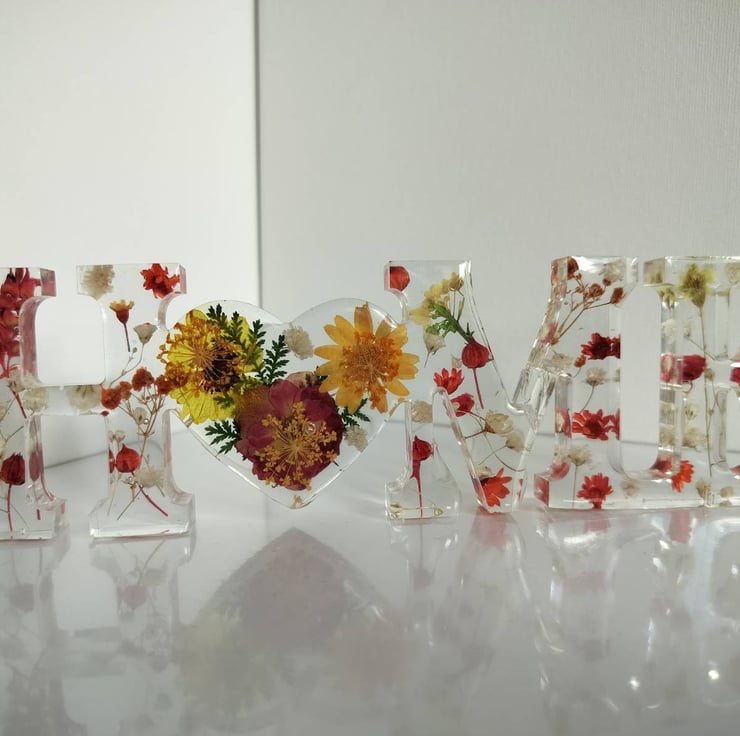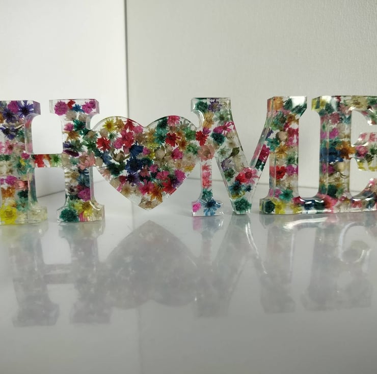 Bring a warm, natural touch to your space with this beautiful handmade HOME resin sign, featuring real dried flowers preserved inside a crystal-clear resin. The heart shaped `O` adds a charming focal point, packed with vibrant colours that brightens any room.