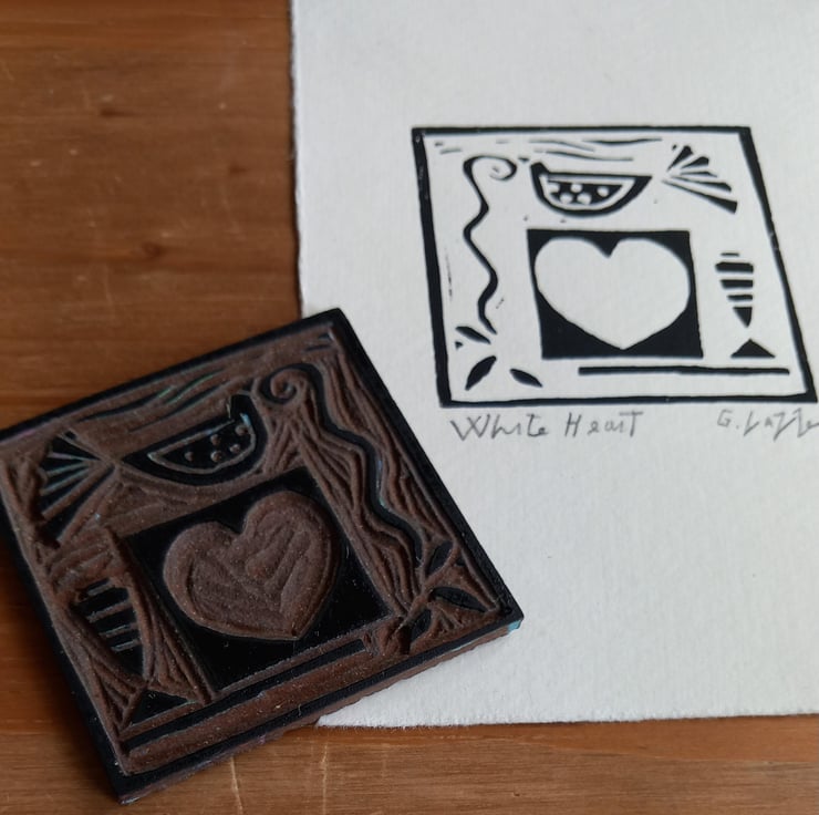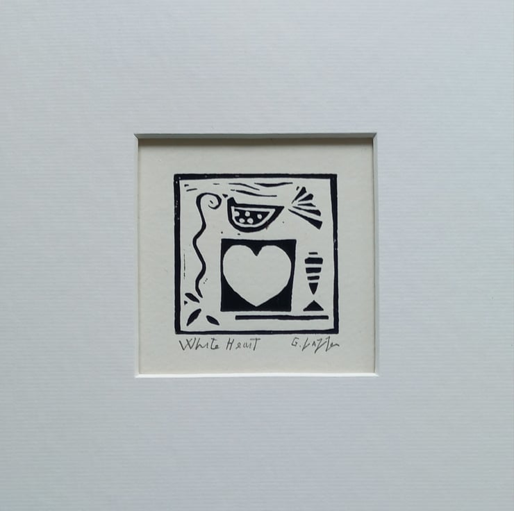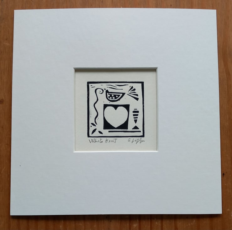 "White Heart" is an Original Mini Lino Cut Print Mounted (NOT a digitally reproduced print).