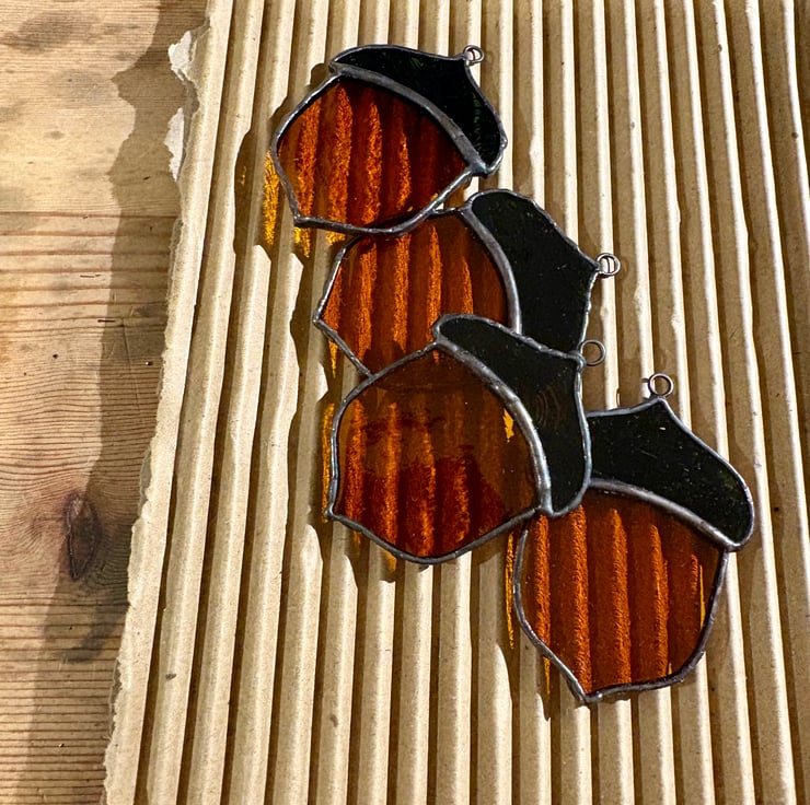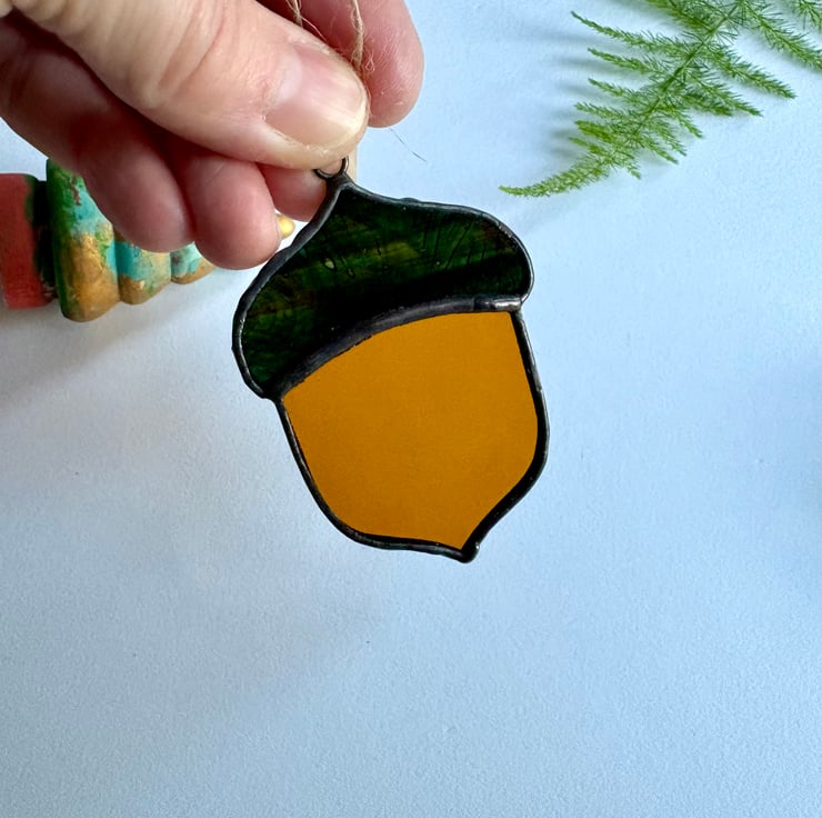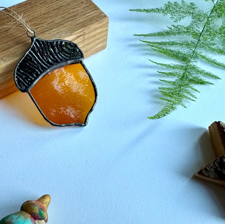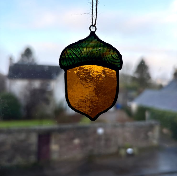 This acorn has been made in my Dunblane studio using traditional Tiffany technique. The stained glass that I used for this decoration has beautiful shades of brown and green and the textures in stained glass used for the top part of the acorn resemble textures in acorns' cap.