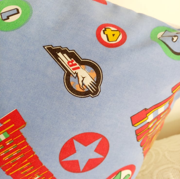 Vintage fabric cushion cover featuring the Thunderbirds logo.