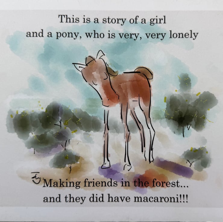 This is a story of a girl and a pony, who is very, very lonely. Making friends in the New Forest and they did have macaroni