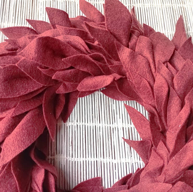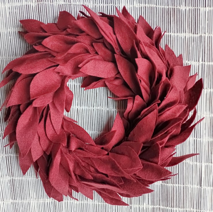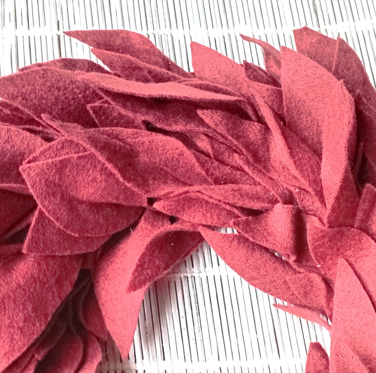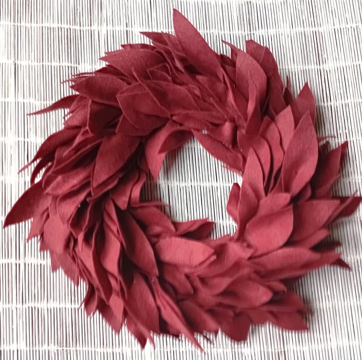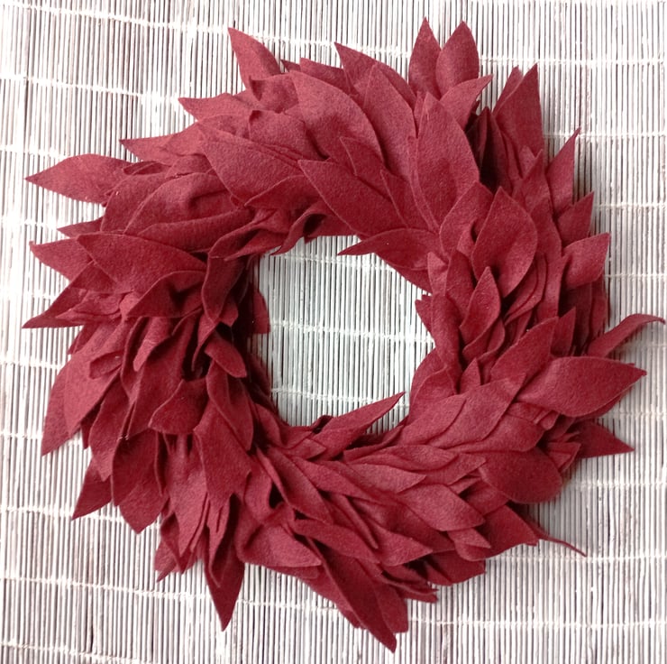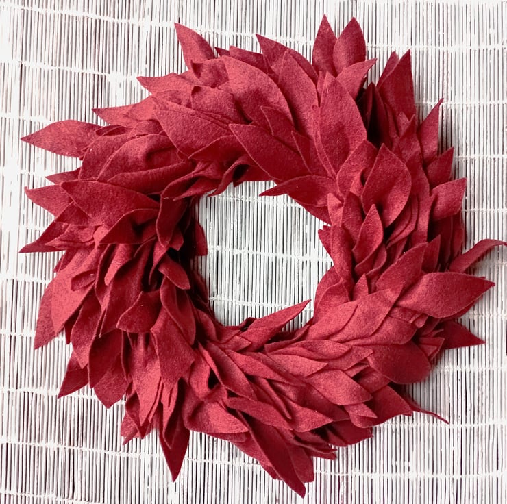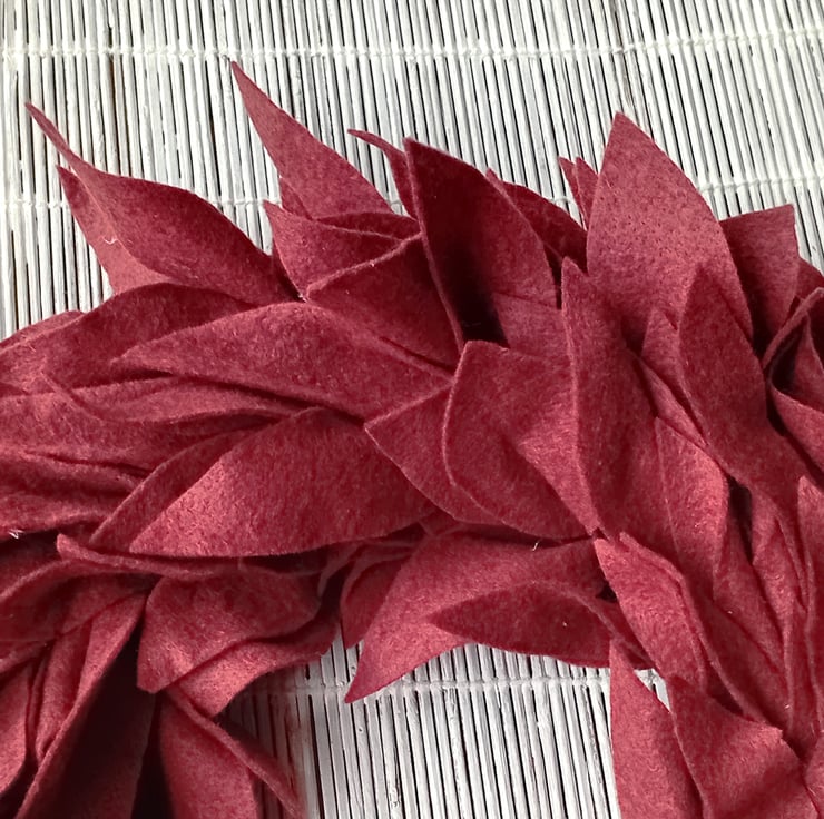 Round wreath made from felt leaf shapes, minimalist, simple, contemporary design.