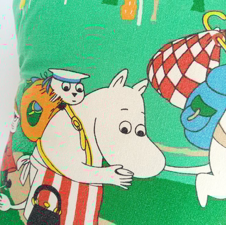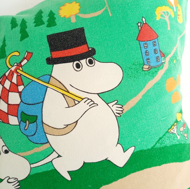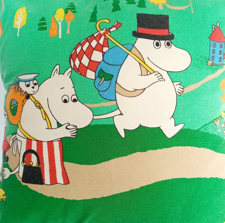 Wonderful vintage Moomin fabric cushion with the Moomins in a forest setting.