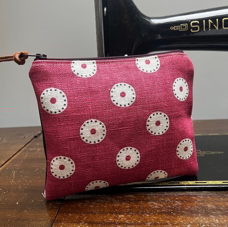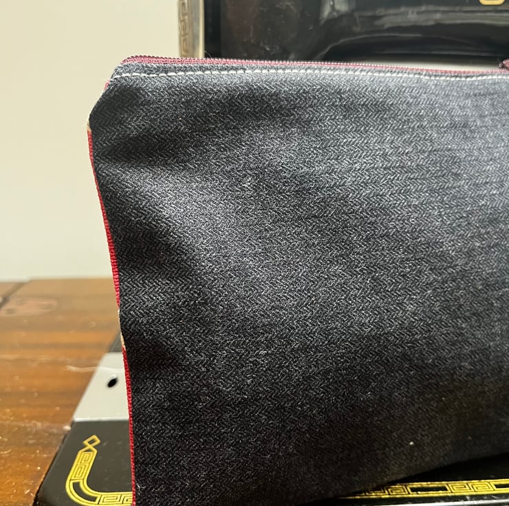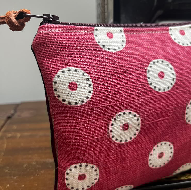 A strip of leather is tied to the zip pull. The leather was waste from a local upholsterer. This can be swapped for ribbon if preferred, just add a note at checkout.