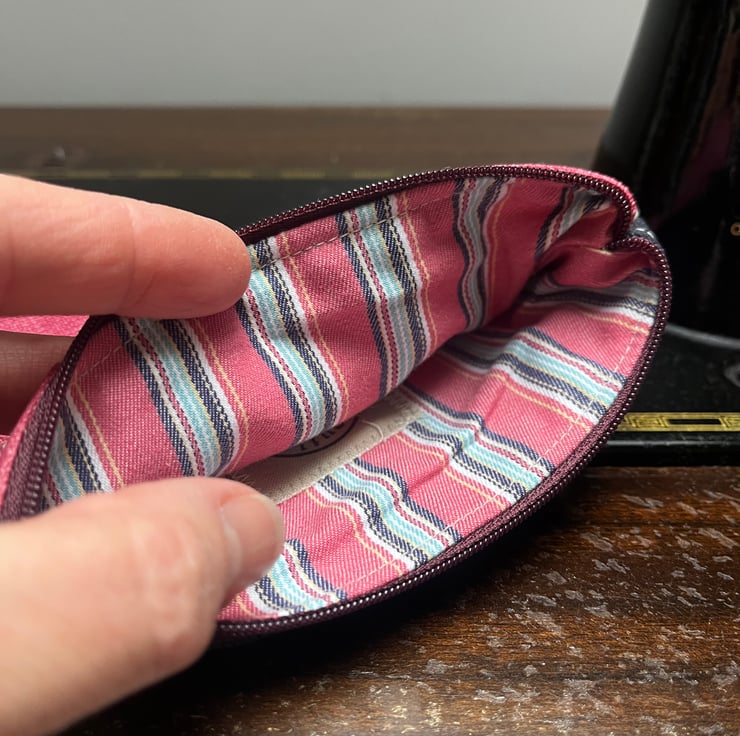Pretty small pouch made from pink Pretty Maids linen union by Vanessa Arbuthnott and soft dark grey fabric taken from a sample swatch. The pouch is lined with reclaimed striped cotton from a shirt.