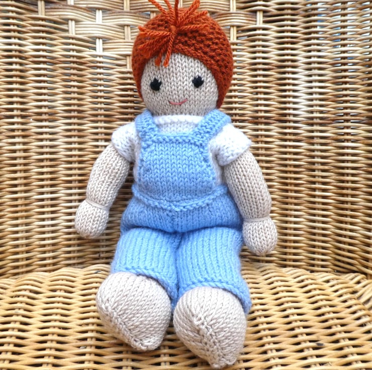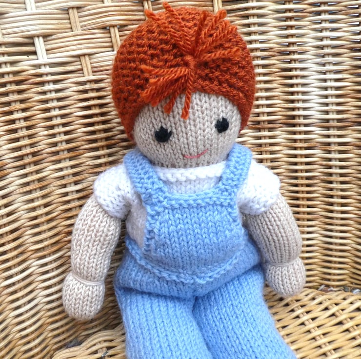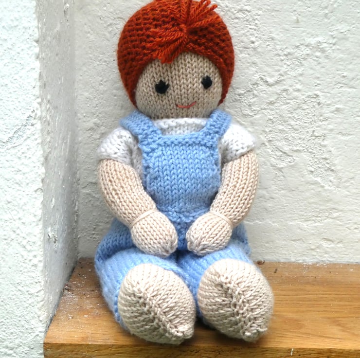 This is a very sweet little boy hand knitted in Merino wool, 12" tall with removeable dungarees, his cap of ginger red hair is acrylic and he is stuffed with lovely soft lambswool.