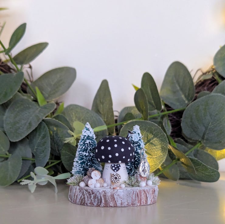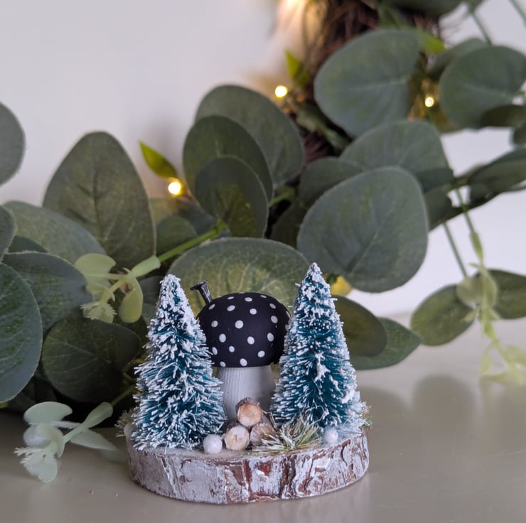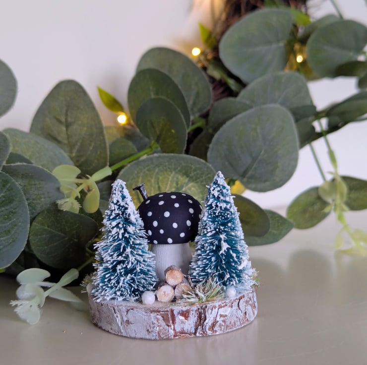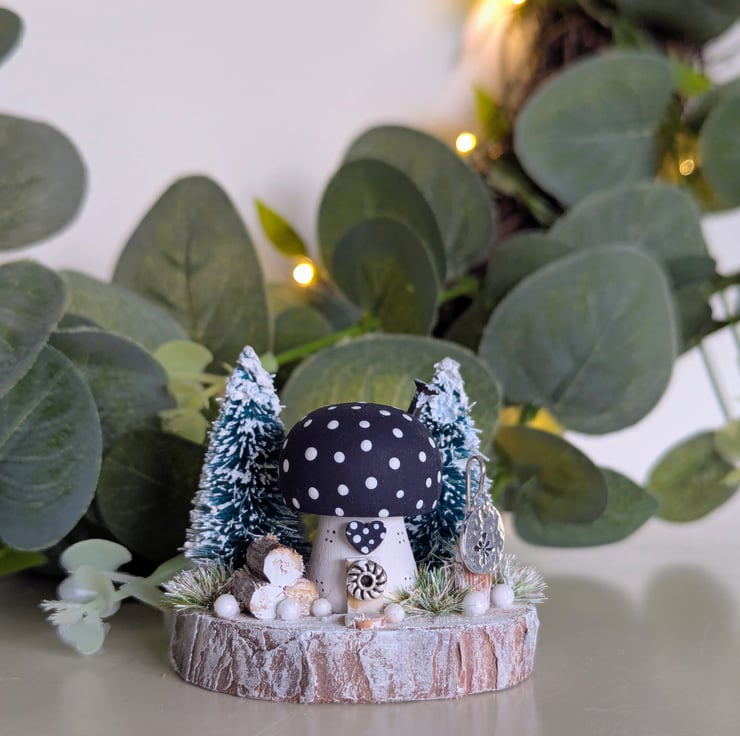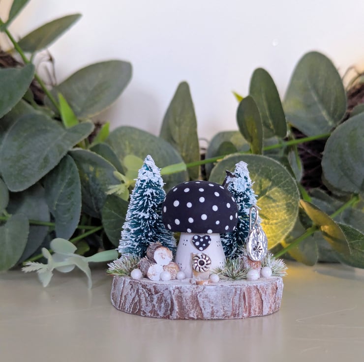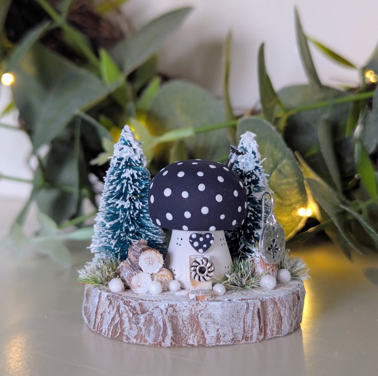 This tiny cosy Christmas toadstool cottage has two snowy trees, log stack, frosted grasses and shimmering snowballs.
