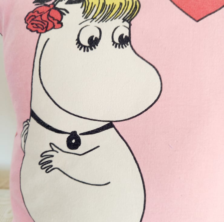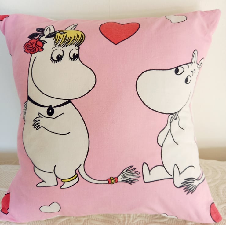A delightful vintage fabric cushion,featuring Moomins and lovehearts on a gorgeous pink background.