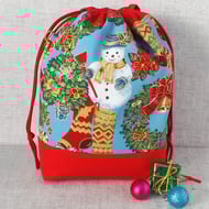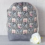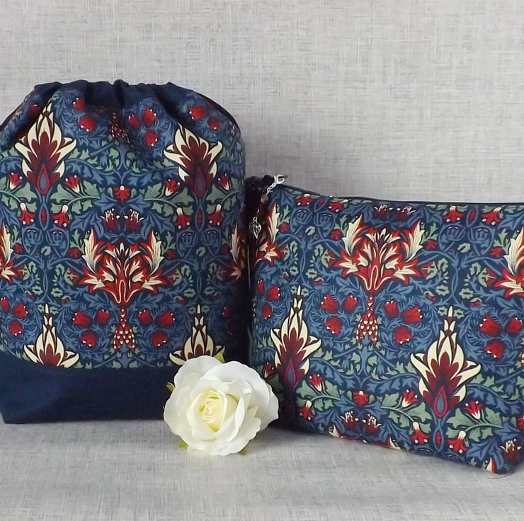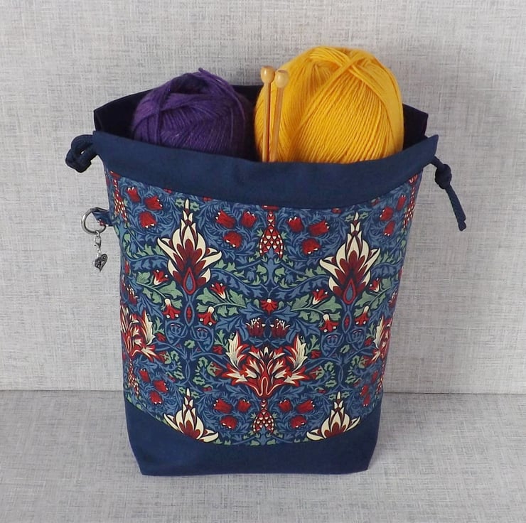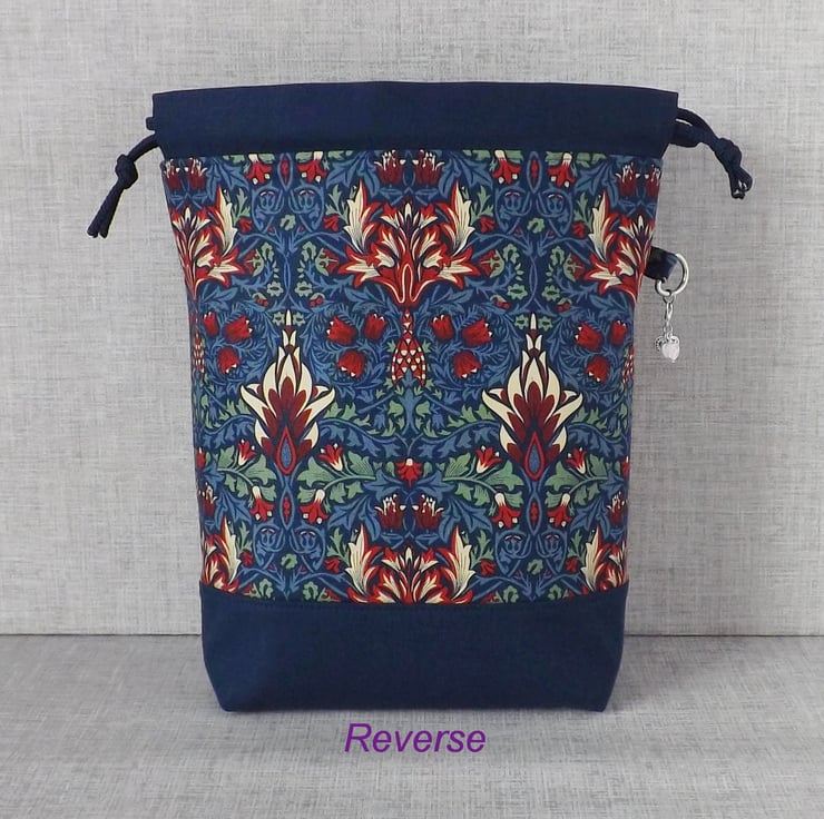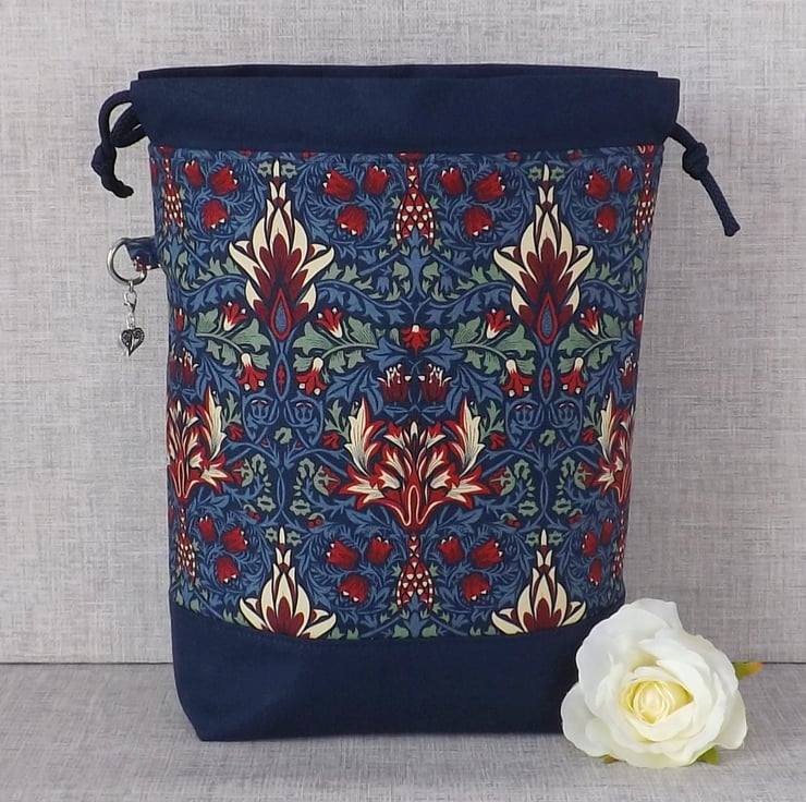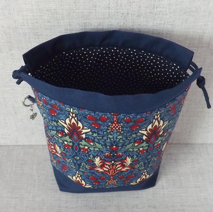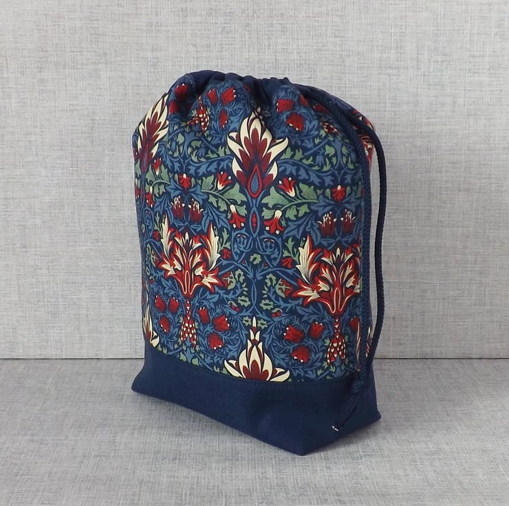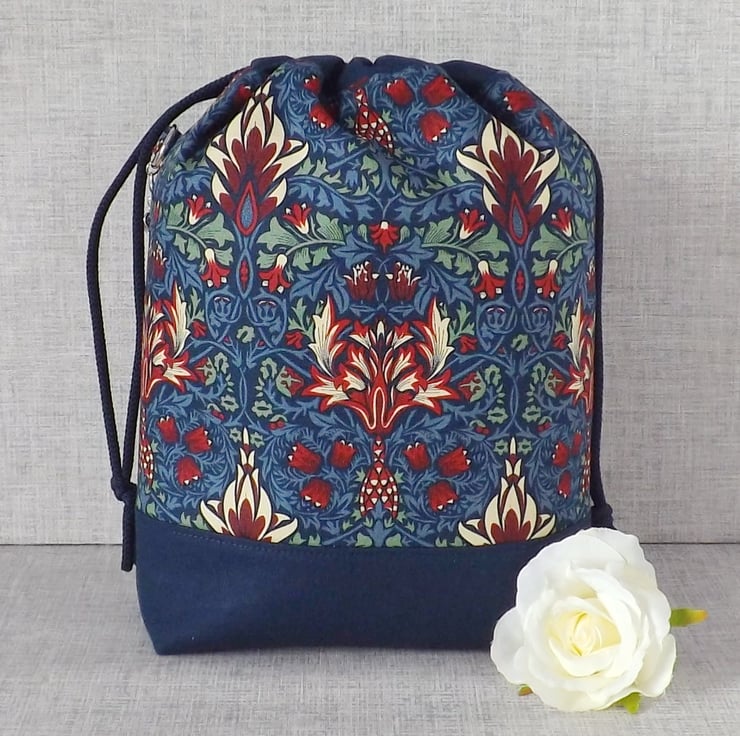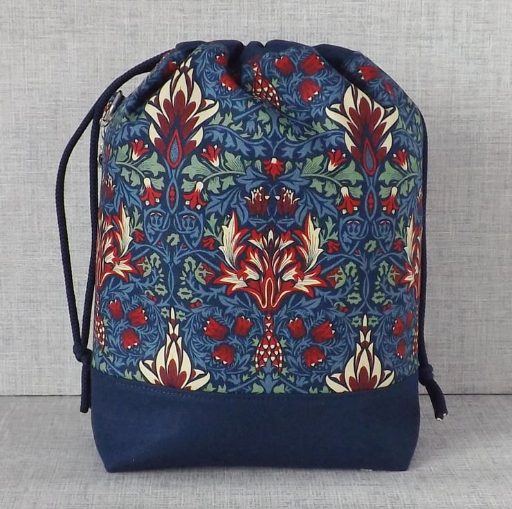A project bag, drawstring bag, made from a lovely cotton fabric from the William Morris 'Winter berries' range, in shades of blue, dark red, green & cream. This is combined with a plain navy blue cotton fabric. The lining is navy blue with small white stars.