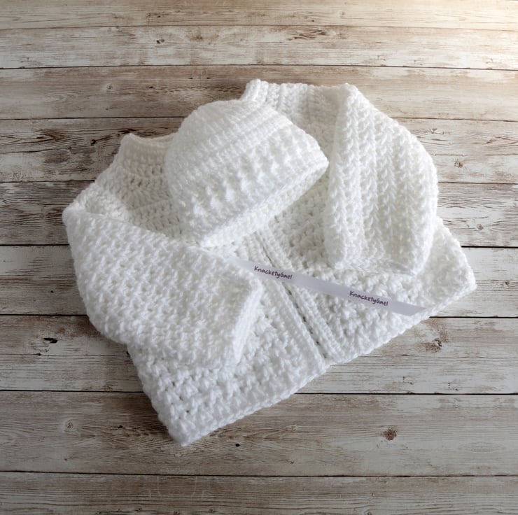 Handmade Crochet Baby Blanket with Cardigan Hat and Booties