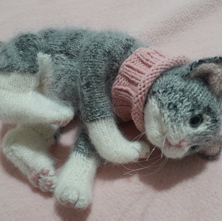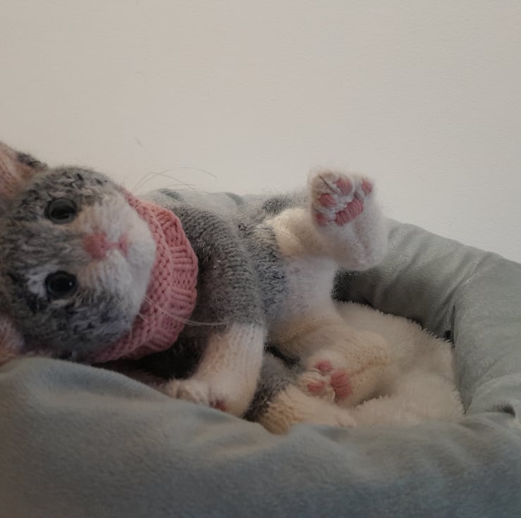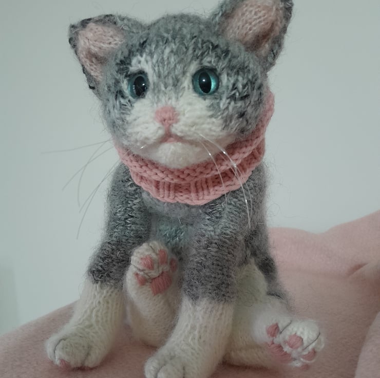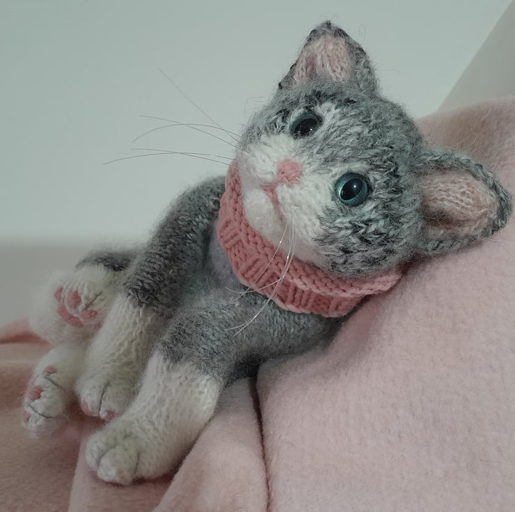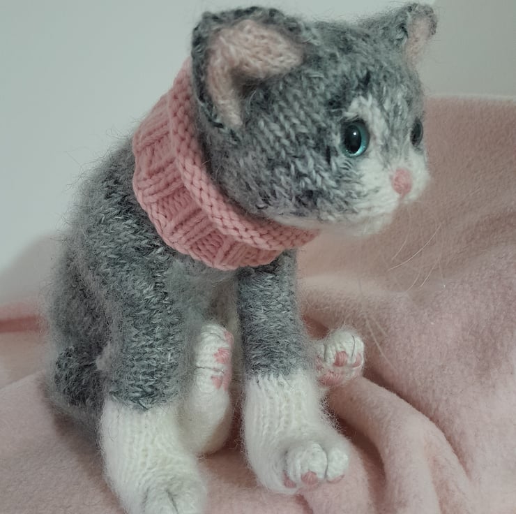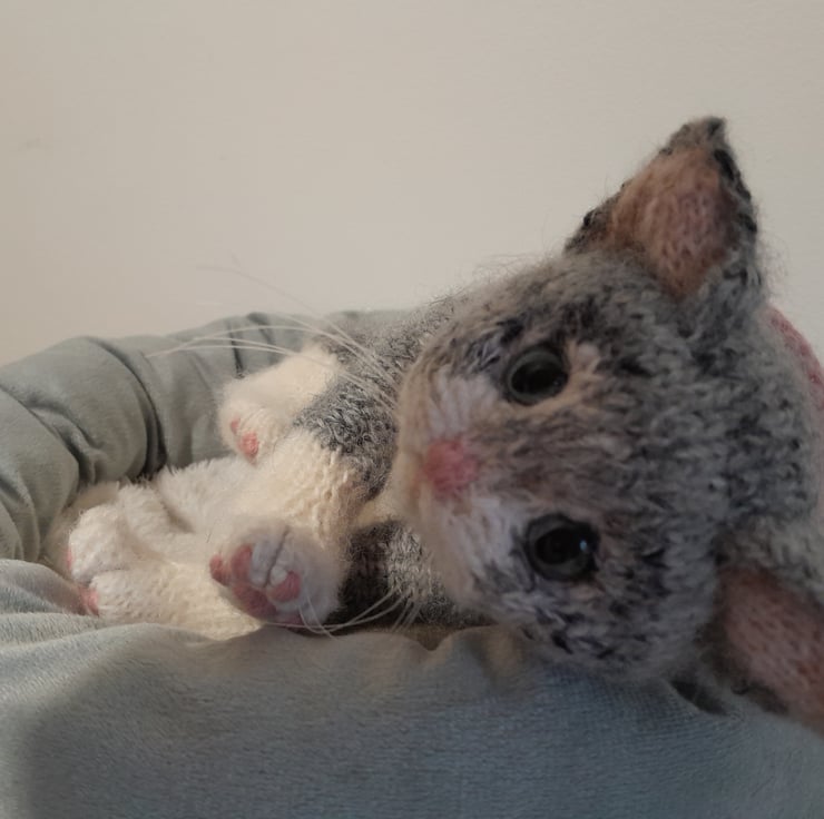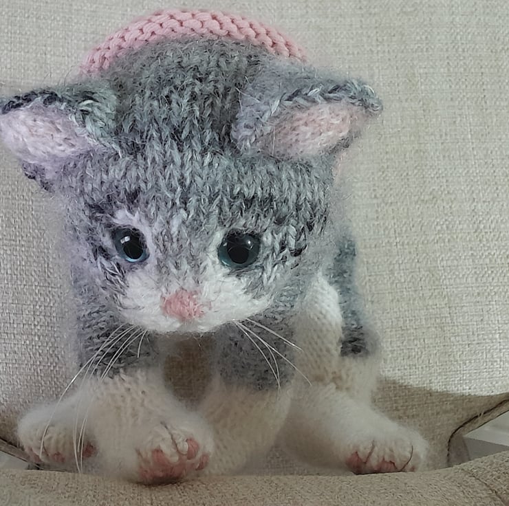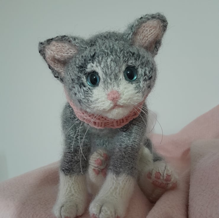 The kitten is knitted in an alpaca yarn in multiple shades of grey together with kid silk mohair yarn. With additional hand brushing to add a soft finish.
