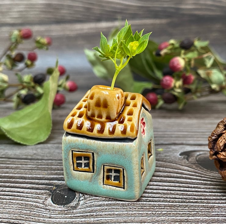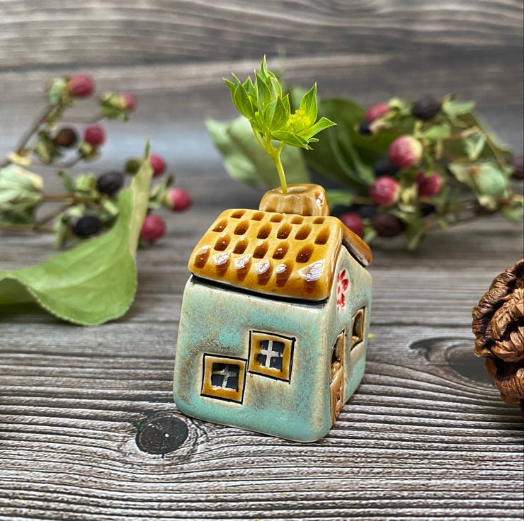 This little handmade ceramic house has been crafted from white earthenware clay and finished with hand-carved details on all sides, including windows, doors, and two red flowers. The honey-coloured roof and chimney add warmth, while the soft green glaze with honey coloured accents gives it a warm and cosy feel.