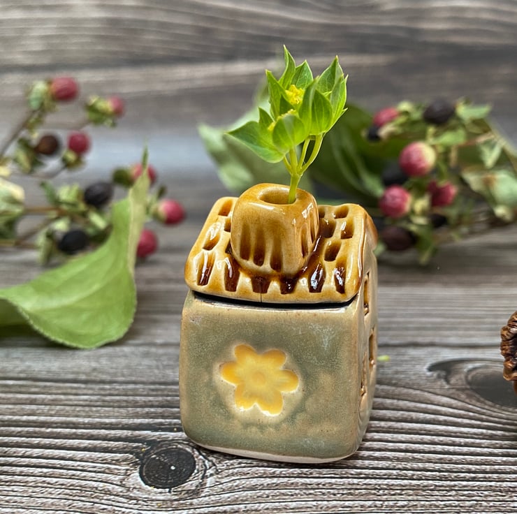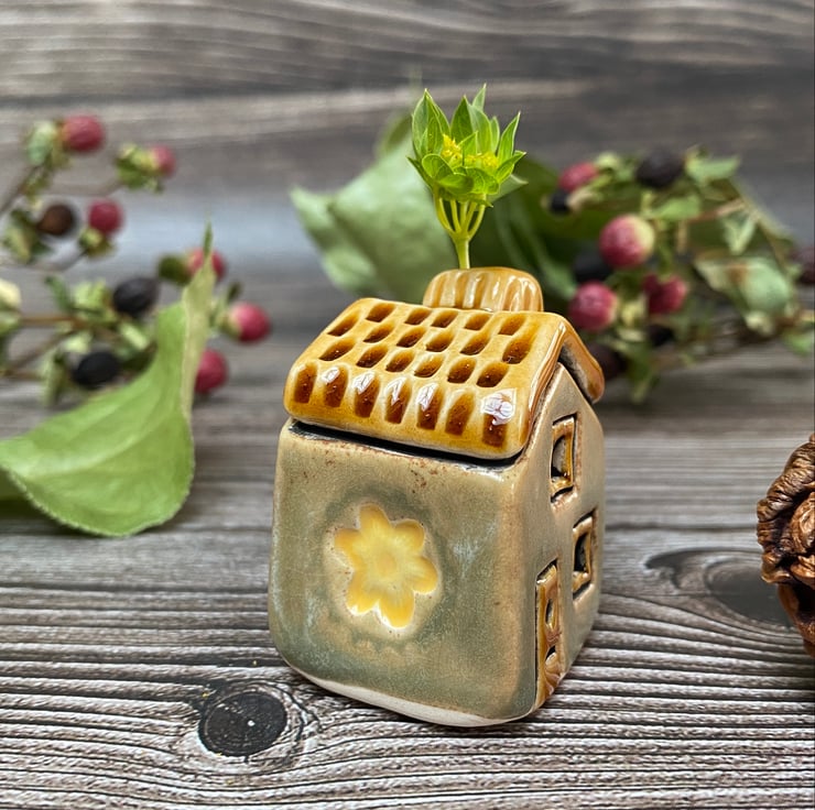 This little handmade ceramic house has been crafted from white earthenware clay and finished with hand-carved details on all sides, including windows, doors, and two yellow flowers. The honey-coloured roof and chimney add warmth, while the green glaze with honey coloured accents gives it a warm and cosy feel.