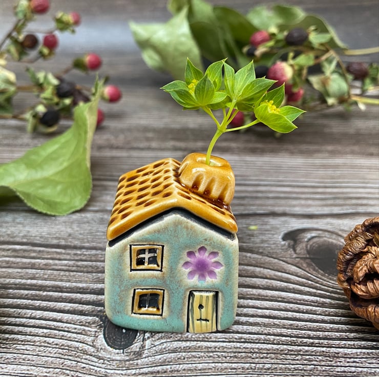 This little handmade ceramic house has been crafted from white earthenware clay and finished with hand-carved details on all sides, including windows, doors, and two purple and two yellow flowers. The honey-coloured roof and chimney add warmth, while the soft green glaze with honey coloured accents gives it a warm and cosy feel.