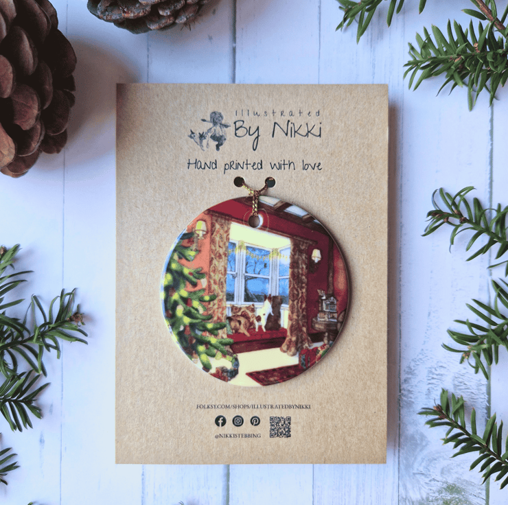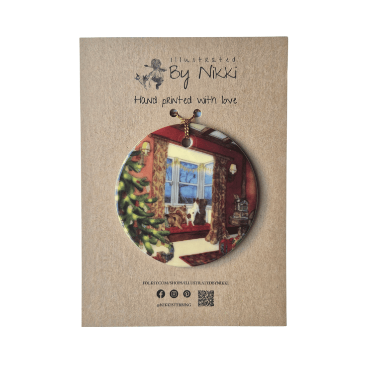 A festive keepsake stitched with story and sparkle. This glossy ceramic ornament features a high-quality print of my original ink and watercolour illustration Waiting for Santa Paws—a cosy scene inspired by our old Thatched Cottage, where Earl, Red, our mischievous Border Terriers, and Georgie Jack Rascal perch by the bay window, watching the wintry night unfold.