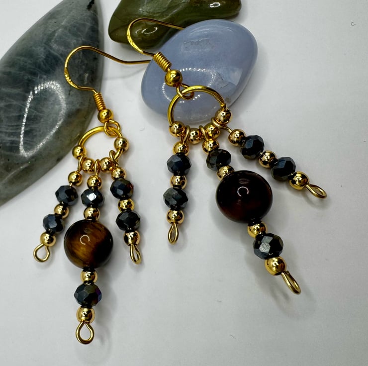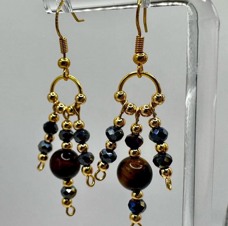 Made with tigers eye beads and black crystal beads with gold toned spacers, and sterling silver hooks with gold toned overlay.