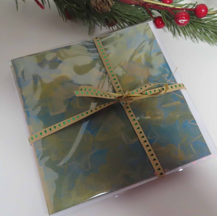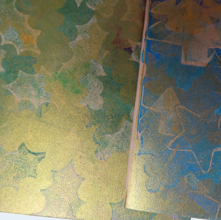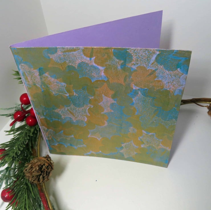 One Off Blank greeting cards gelli printed with Christmas motifs.