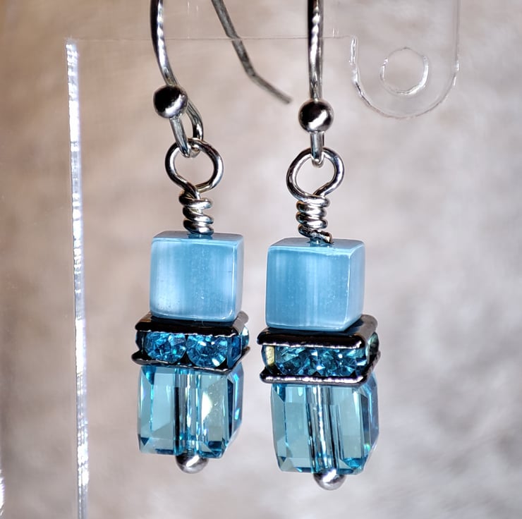 Crystal earrings with silver plated wires. Made with glass crystal beads and rhinestone spacer beads on silver plated wire, hanging from silver plated earwires. Approximately 2.5cm from bottom of the earwire to the bottom of the beads.
