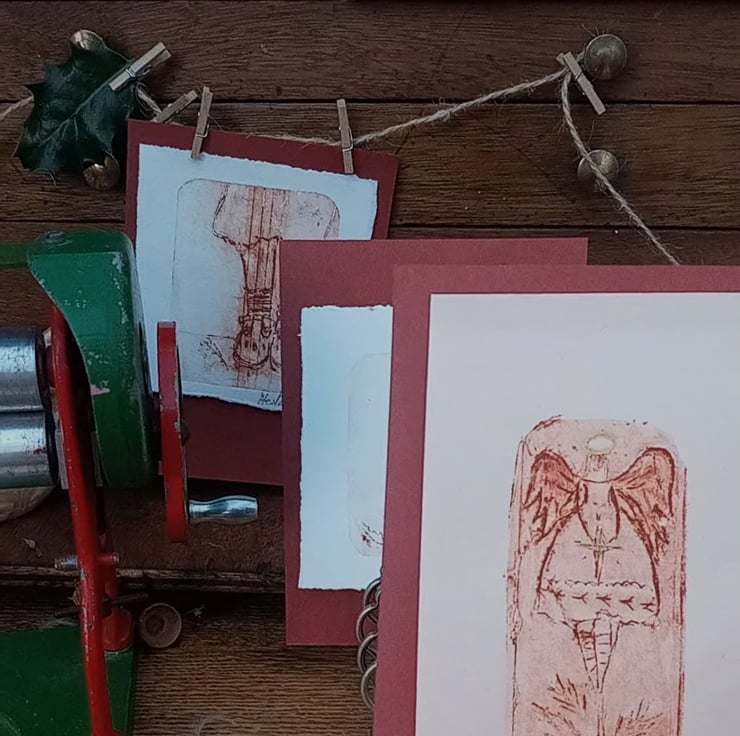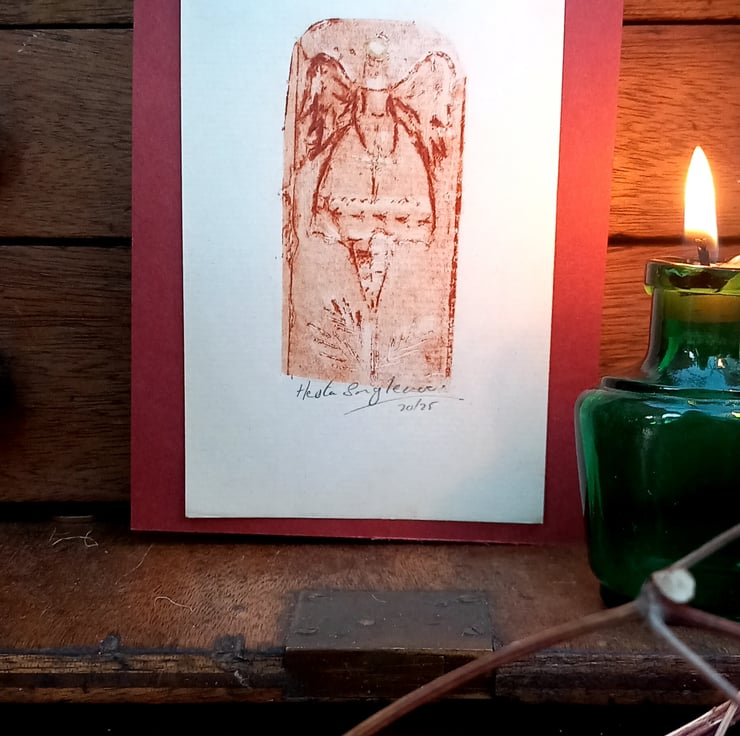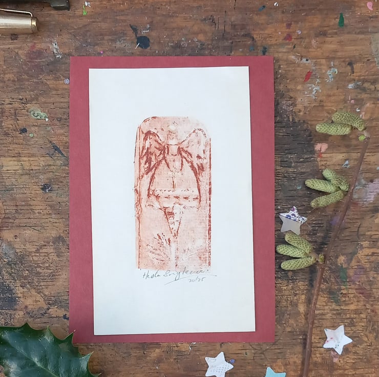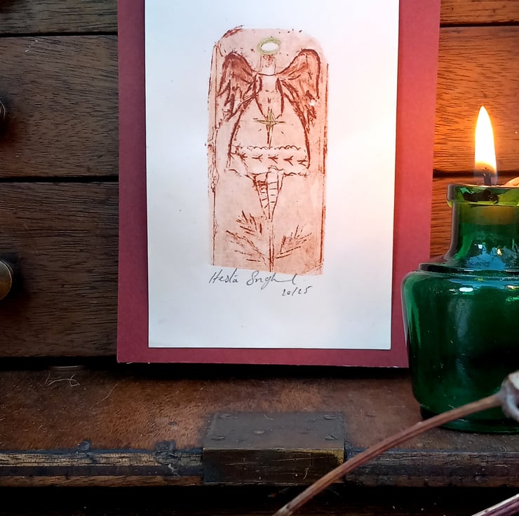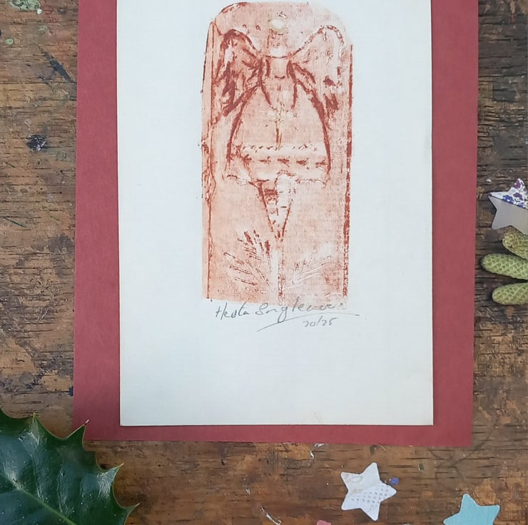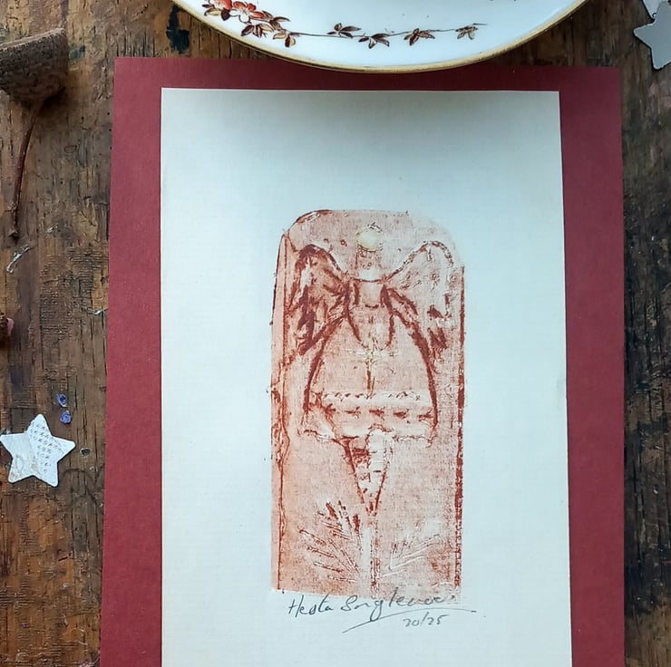 Limited edition print of my tree angel, printed on a small child's vintage mangle. My own very special techniques. I add a hint of gold on her halo . Charming miniature work of art. Send as a gift or have it framed. Each one perfectly imperfect as one off pieces such is hand printing. A cottage industry making small magical art with care and comes mindfully packaged. I use a quality paper measuring 15cm.by 9cm. Free UK.postage
