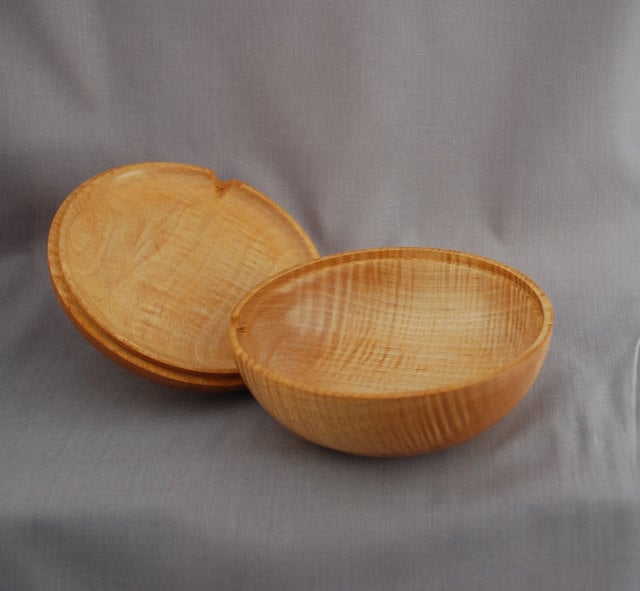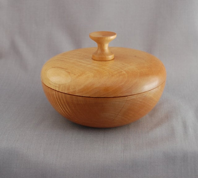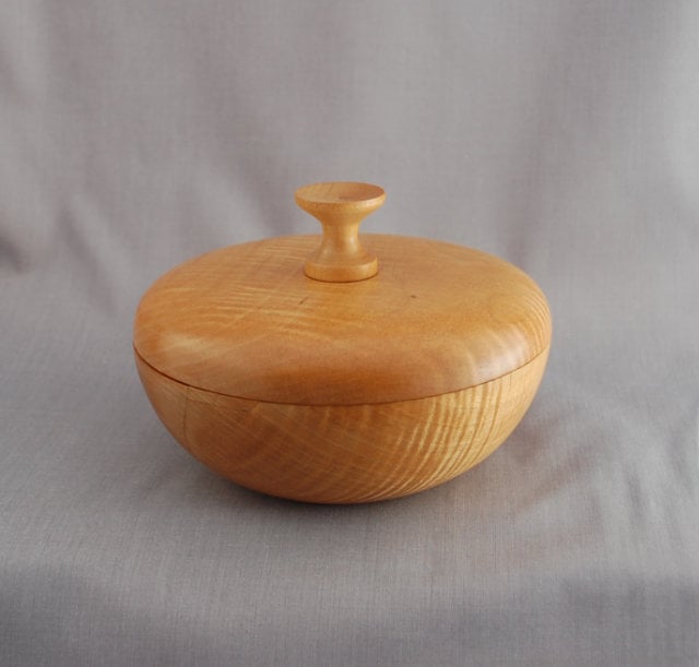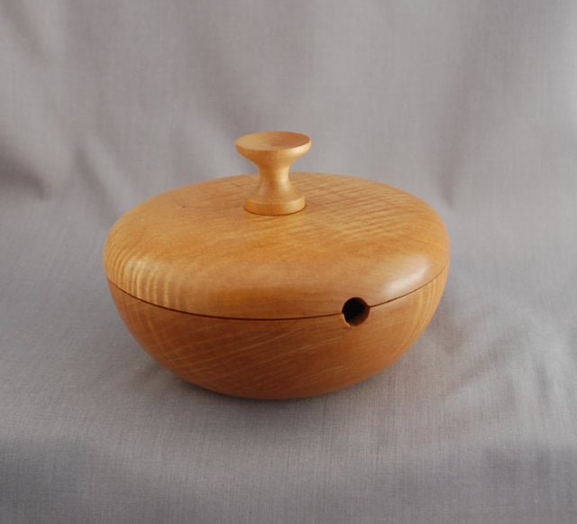 This beautiful covered dish has been turned by Randal from a fascinating piece of ripple sycamore. Soft tones of cream, sand, and gleaming pearl-like grain makes it singularly beautiful whichever way it is being viewed. Fill it with bath salts, loose lavender flowers, pot pourri, add a scoop, then all ready to stir the contents or dish them up to add fragrance to a bath or room. It measures approximately 8 cm high and 7 cm wide, base is 9.5 cm wide, cloche total height 8.5 cm.