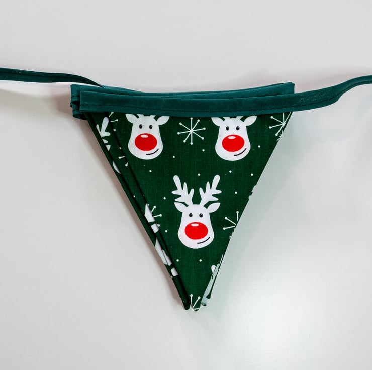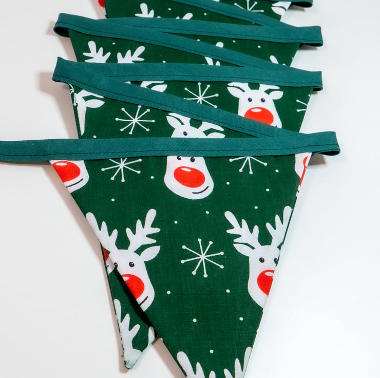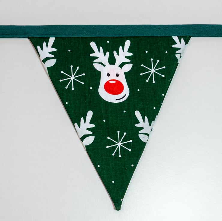Beautiful bunting featuring a dark green background peppered with red nose reindeers!