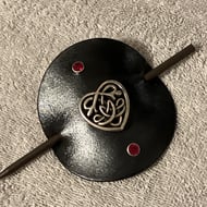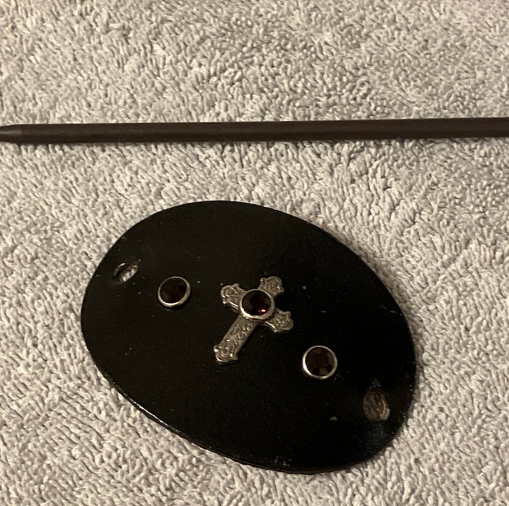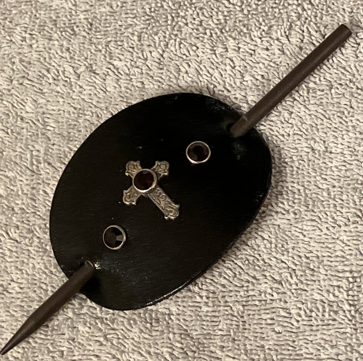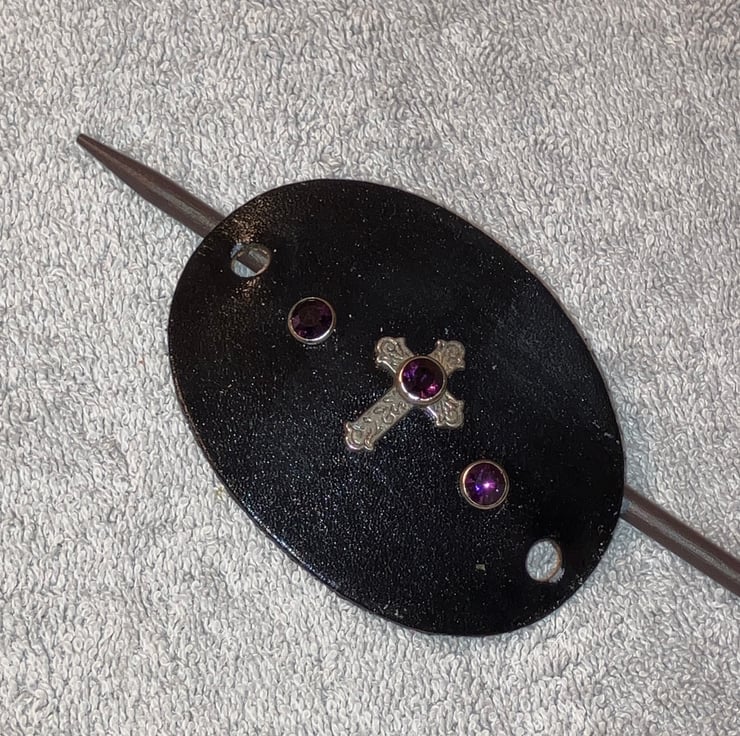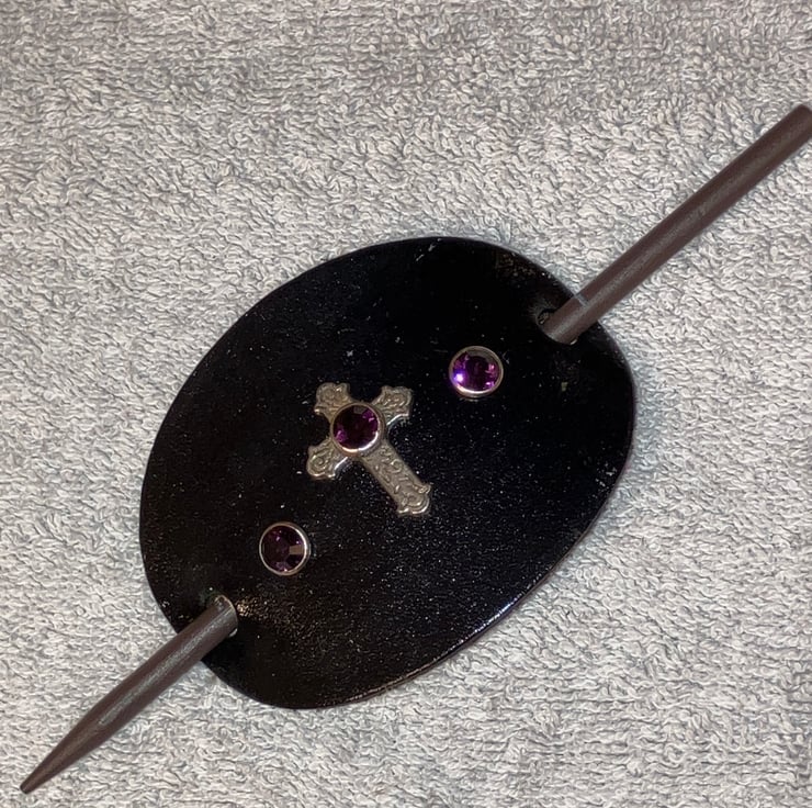 Black Leather HairStick Barrette w Cath Cross centre w 3 Amethyst Gems