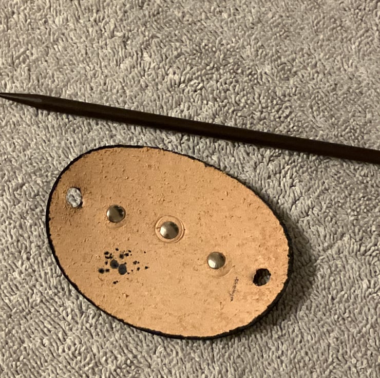 The leather is roughly 3.25 inches across in an oval shape. The black wood hair stick is 6" in length. I find these work best with a thin ponytail holder used underneath - it acts as a stopper so that it doesn't slide down your hair. There is a Catholic Cross bezel concho in the center that is held in place AND flanked by dark amethyst gemstones that are riveted to the leather.