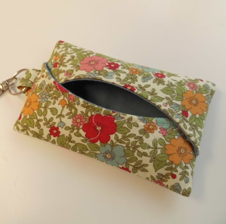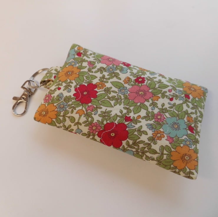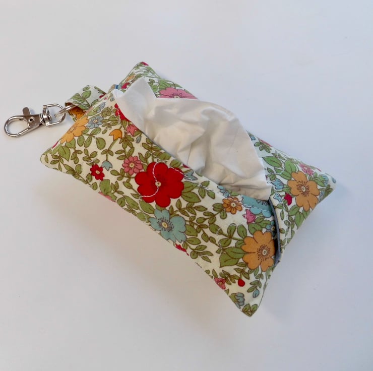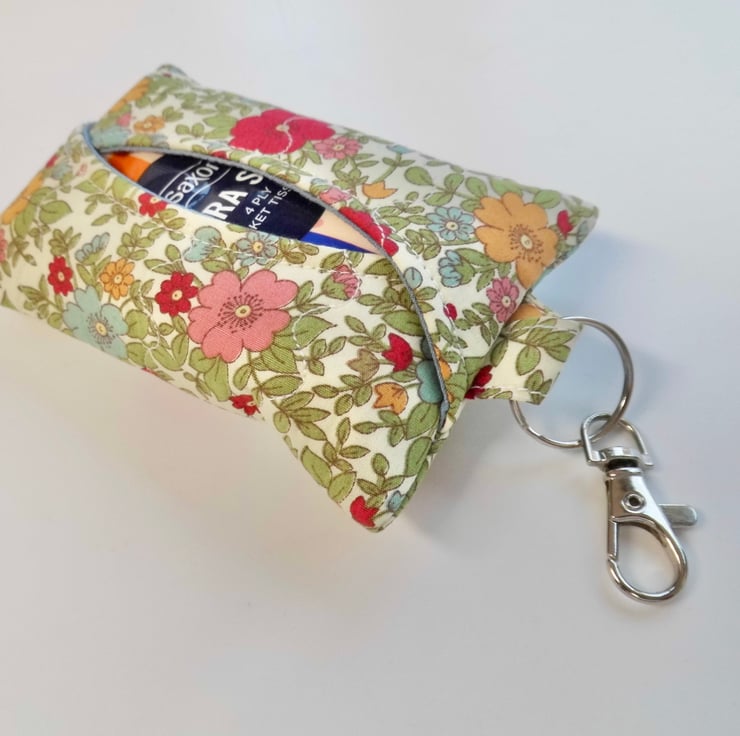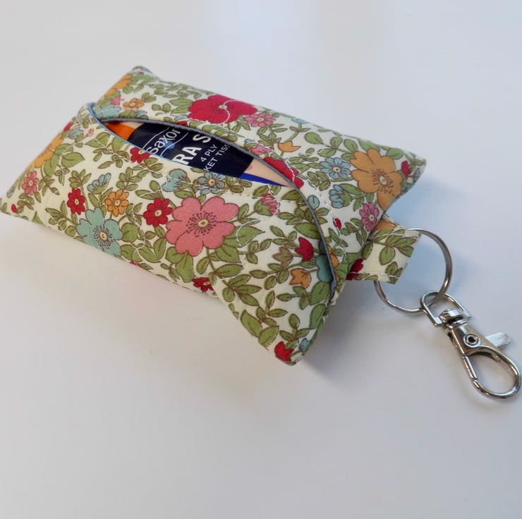 Here's a handy little pouch designed to keep a packet of tissues neat and tidy and clipped somewhere handy on your keyring or in your bag. But really it has many uses, because you could instead put a couple of spare fabric hankies in it, or spare face mask, or a foldaway shopping bag or doggie poo bags.