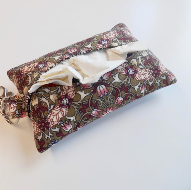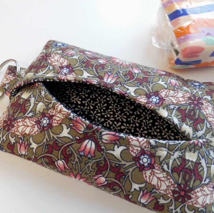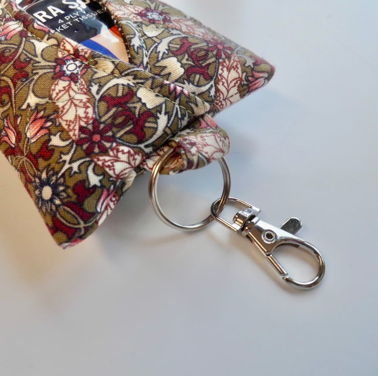 Here's a handy little pouch designed to keep a packet of tissues neat and tidy and clipped somewhere handy on your keyring or in your bag. But really it has many uses, because you could instead put a couple of spare fabric hankies in it, or spare face mask, or a foldaway shopping bag or doggie poo bags.